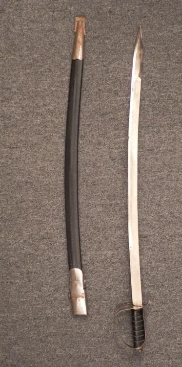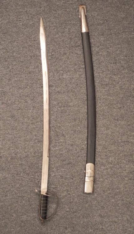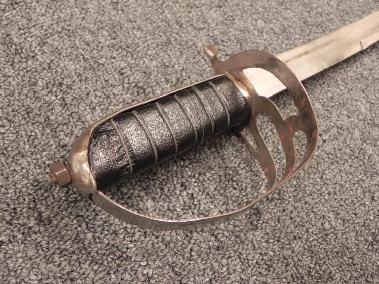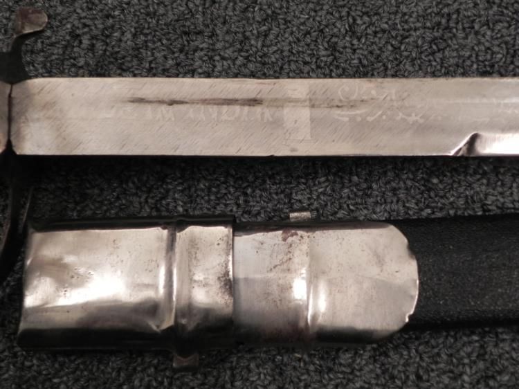 This an older Indian sword with engraved blade and scabbard. The grip has leatherette and wire wrap. The blade is marked Made In India, and has a decorative pattern. There is some in/out wear and marks. The scabbard has leatherette, and the drag has minor surface rust. The blade length is 29 1/2", and the overall length out of the scabbard is 35 1/2". This sword will be great on the wall of any collector.