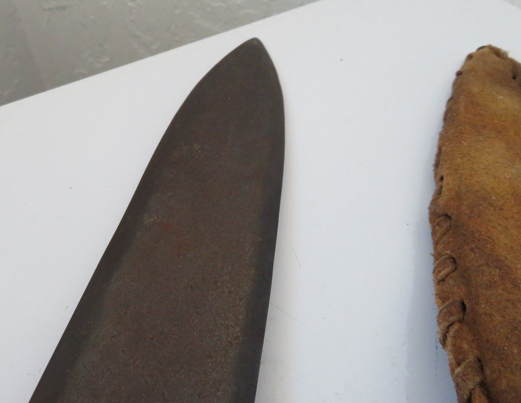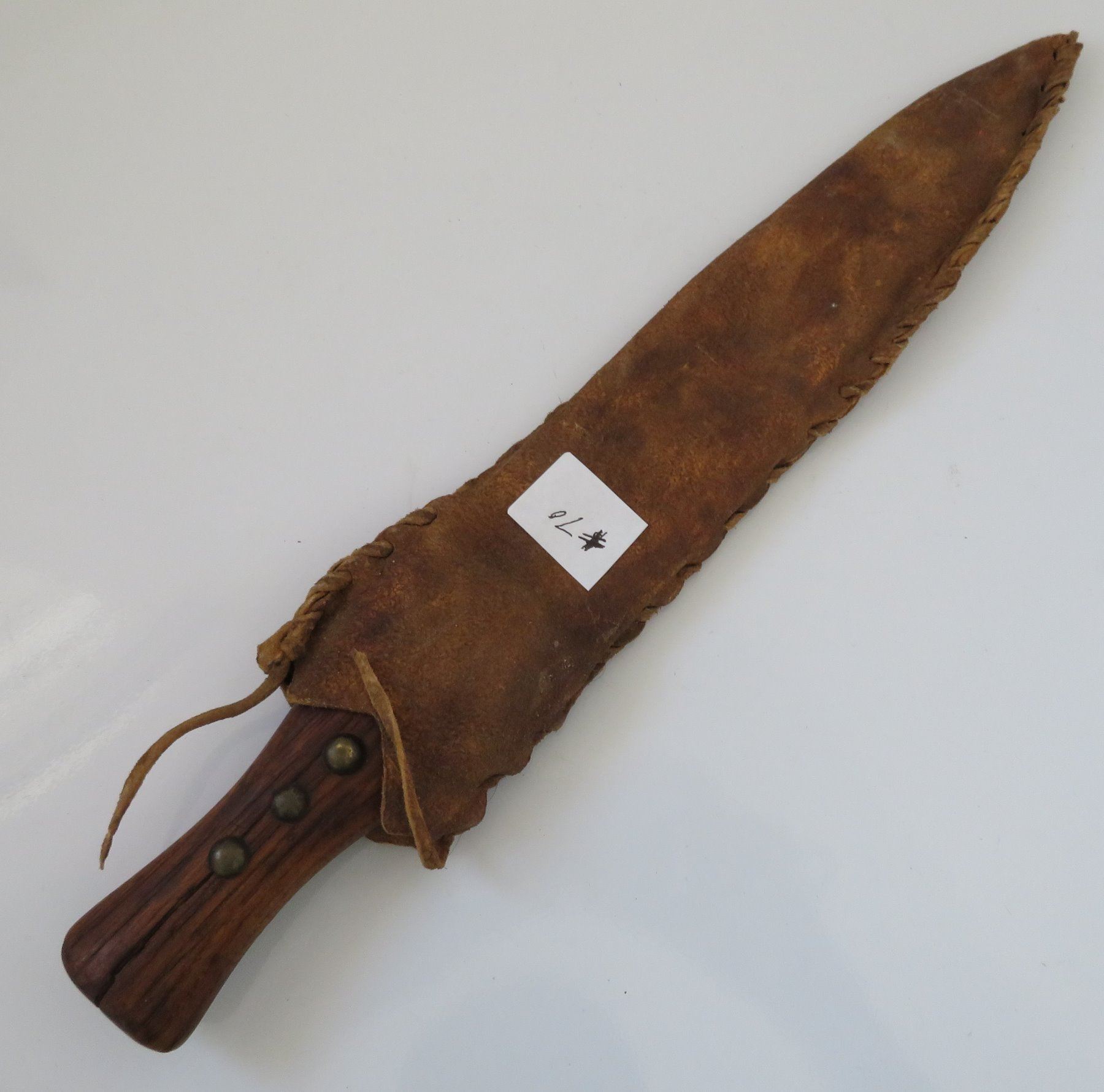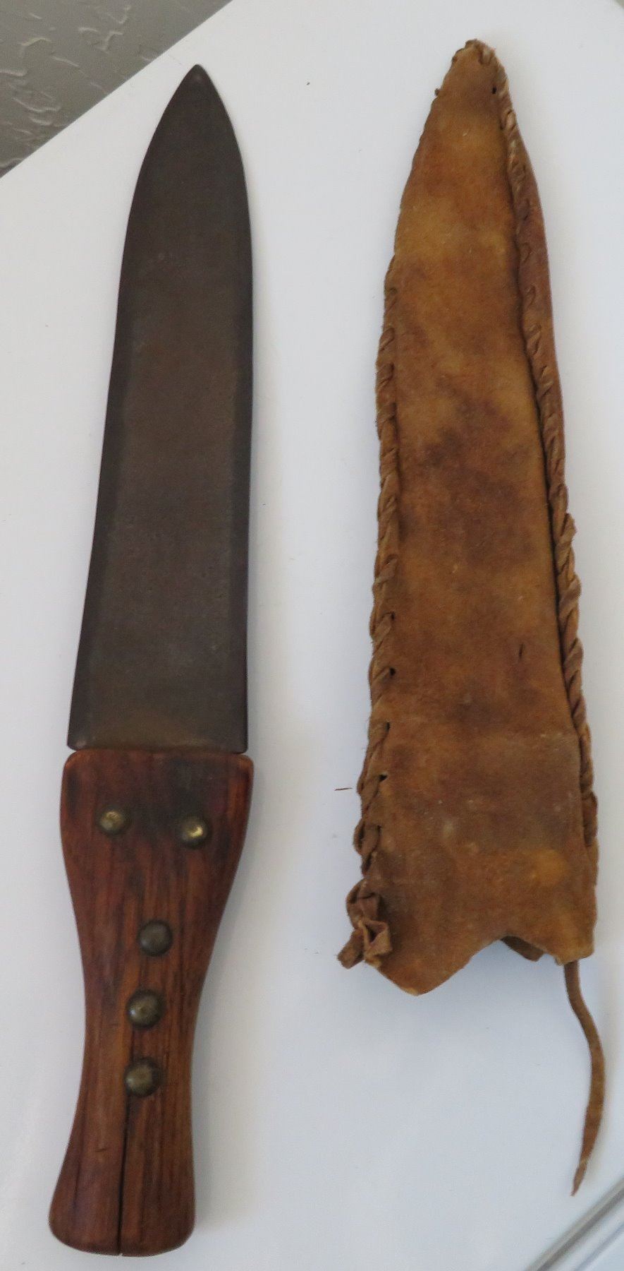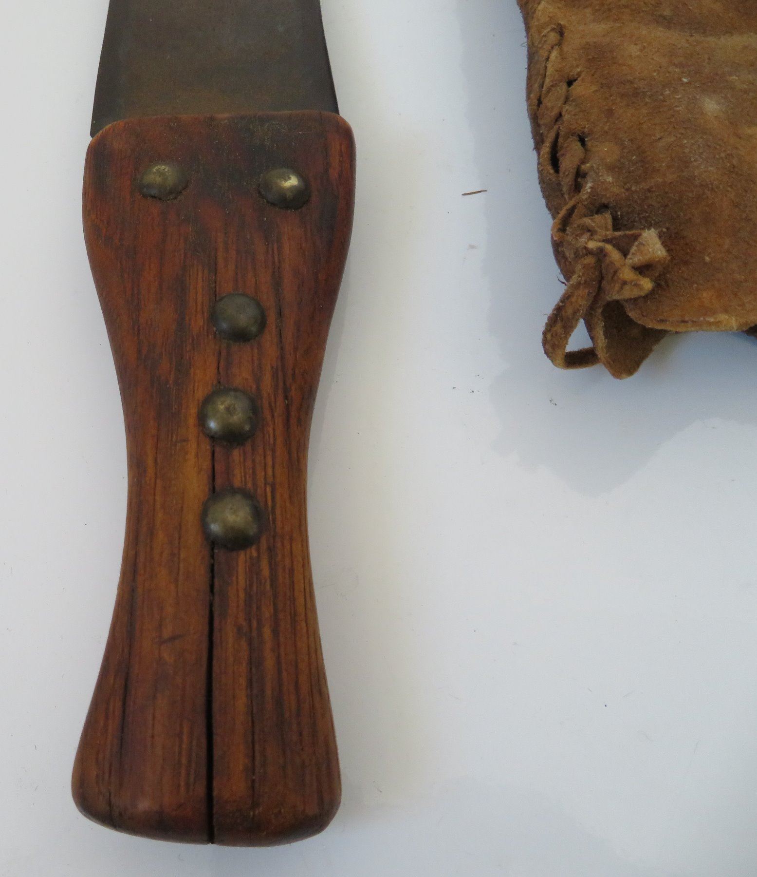 Indian Wars Dag Knife, c. 1850-80s. Made of wood, brass tacks, carbon steel and parfleche, the item measures 16 1/2" x 4". Northern Plains, Blackfoot. Northern Plains Indian Wars period dag knife adorned with brass tacks in a rawhide, hide-thonged sheath. Condition: Excellent with minor signs of wear, see images. Shipping: $40.00 w/insurance and signature, due to value.