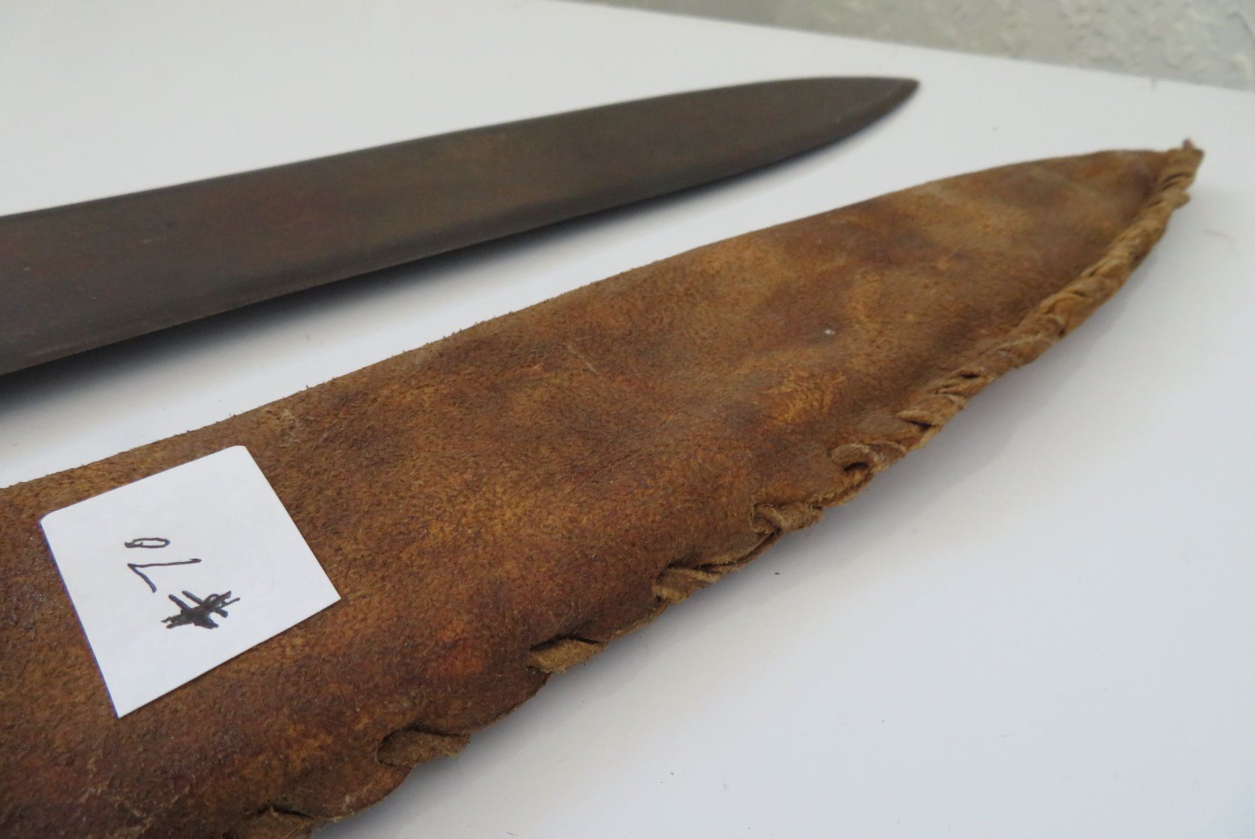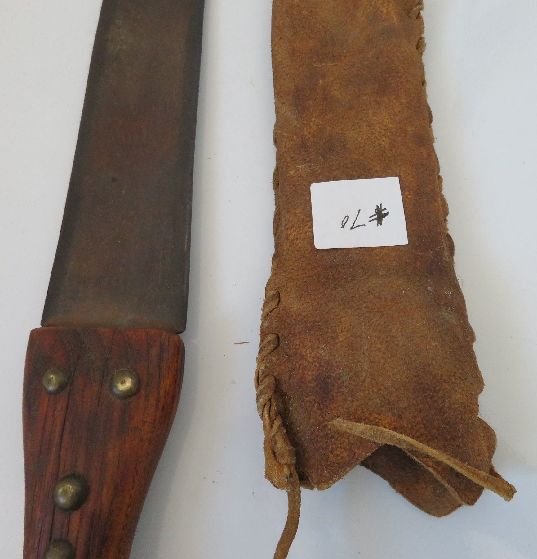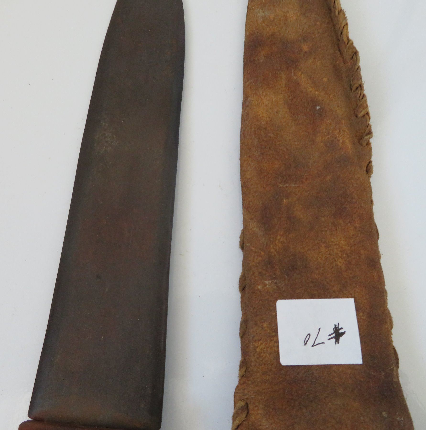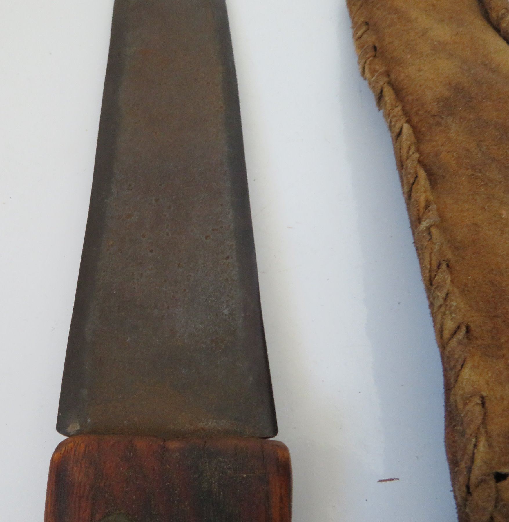 Indian Wars Dag Knife, c. 1850-80s. Made of wood, brass tacks, carbon steel and parfleche, the item measures 16 1/2" x 4". Northern Plains, Blackfoot. Northern Plains Indian Wars period dag knife adorned with brass tacks in a rawhide, hide-thonged sheath. Condition: Excellent with minor signs of wear, see images. Shipping: $40.00 w/insurance and signature, due to value.