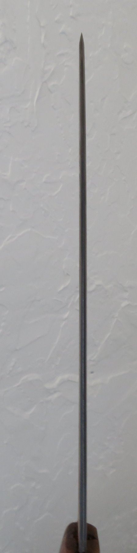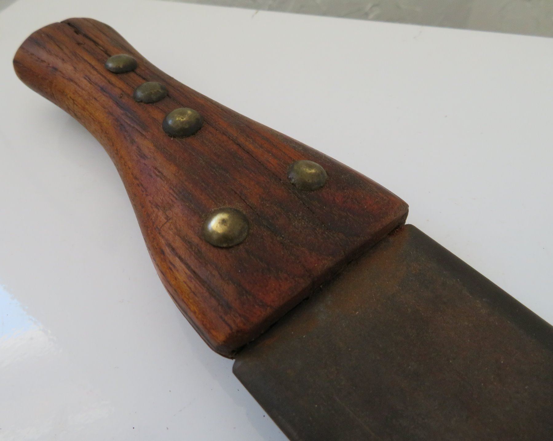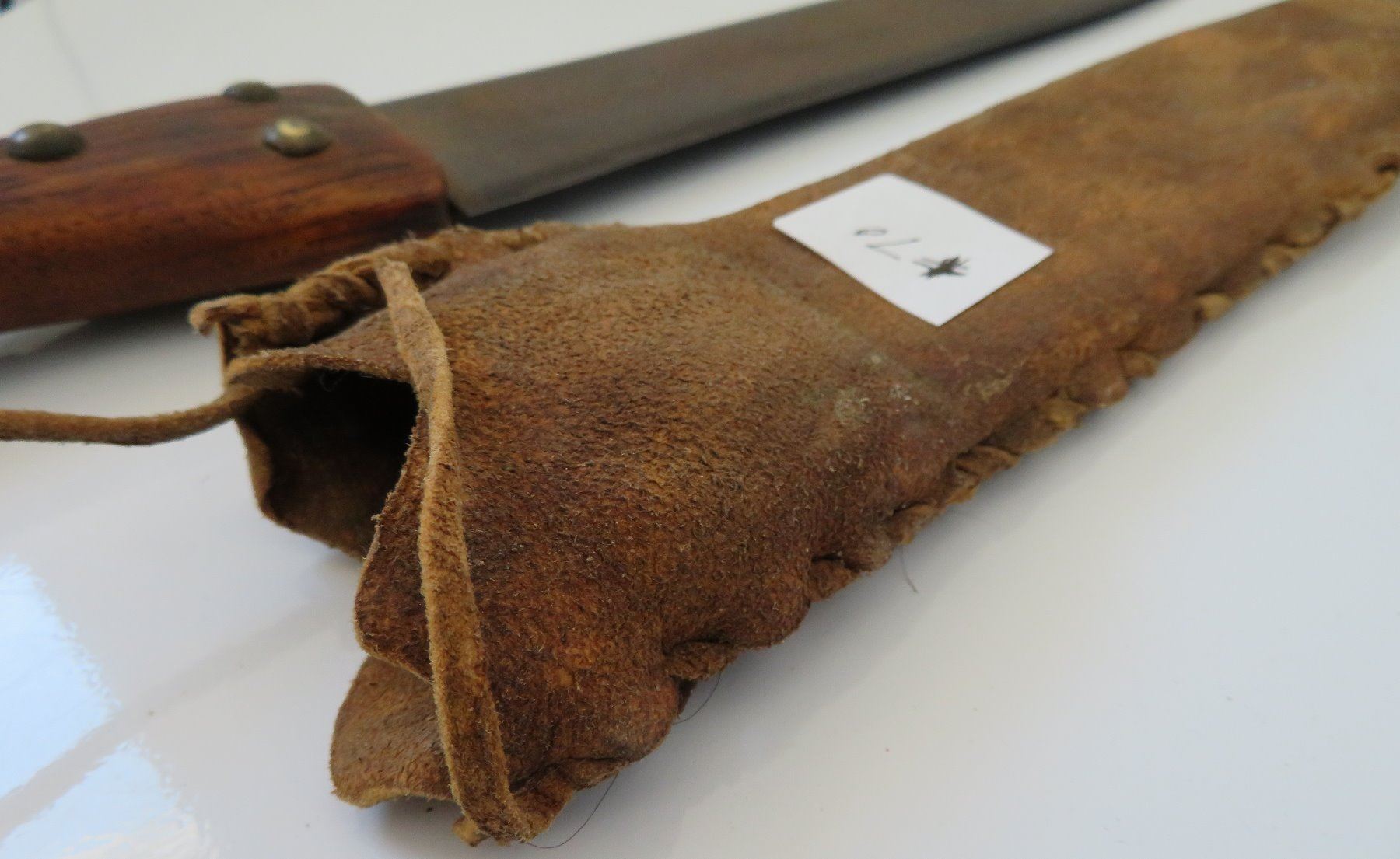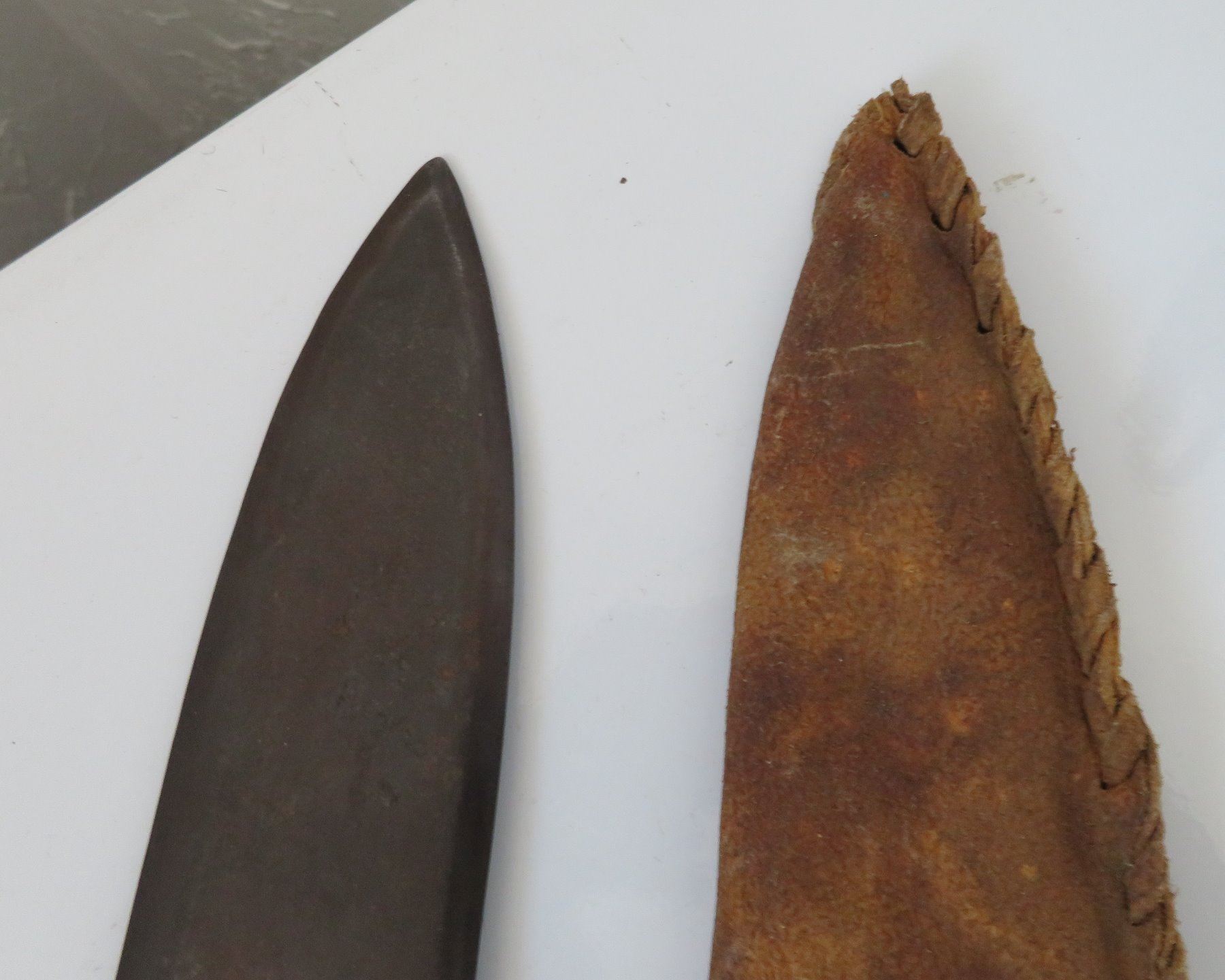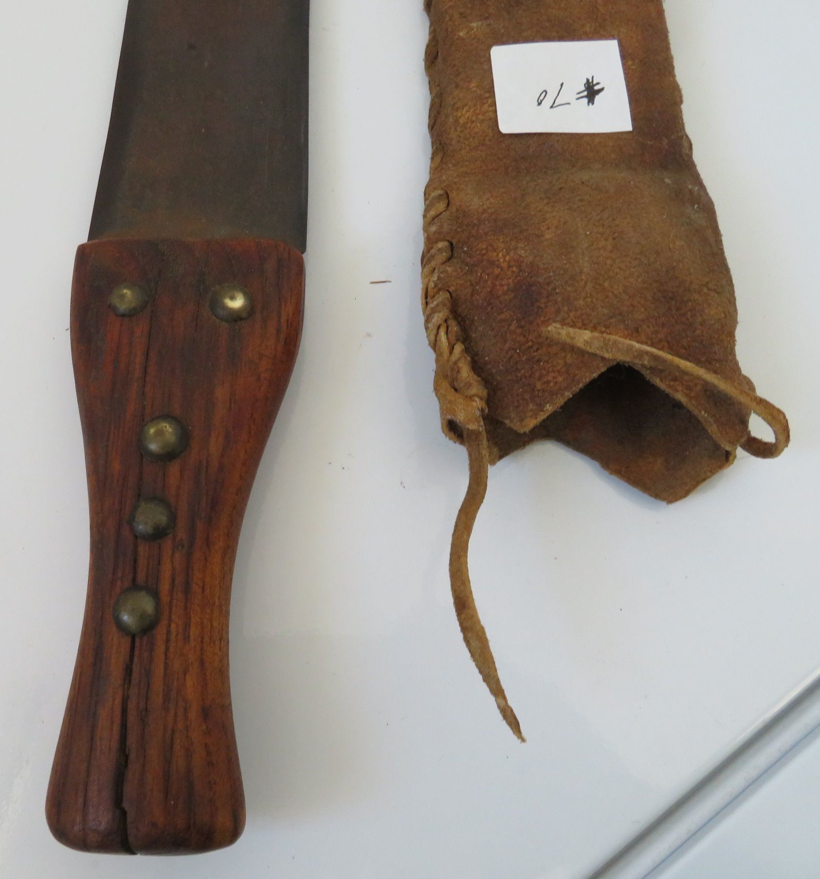 Indian Wars Dag Knife, c. 1850-80s. Made of wood, brass tacks, carbon steel and parfleche, the item measures 16 1/2" x 4". Northern Plains, Blackfoot. Northern Plains Indian Wars period dag knife adorned with brass tacks in a rawhide, hide-thonged sheath. Condition: Excellent with minor signs of wear, see images. Shipping: $40.00 w/insurance and signature, due to value.