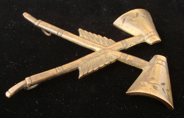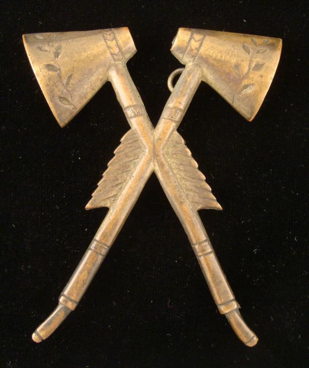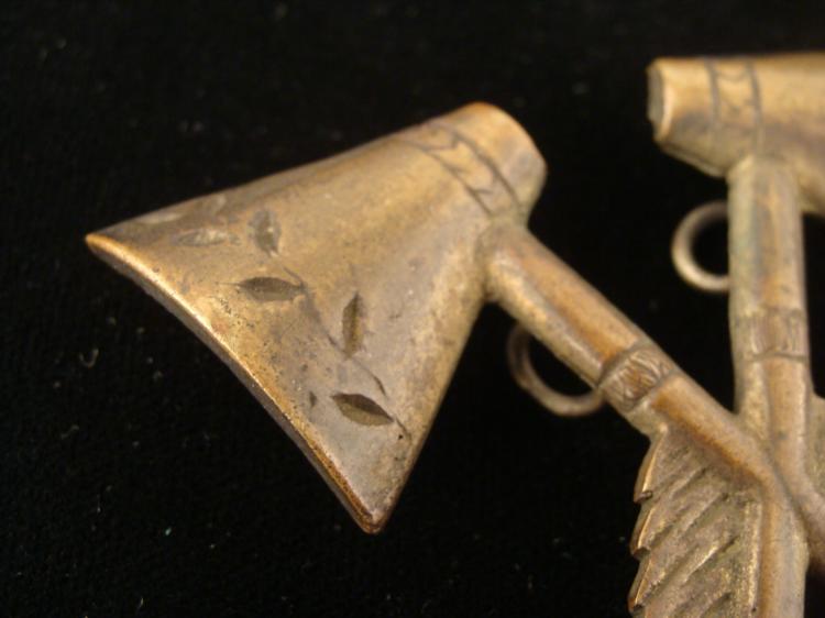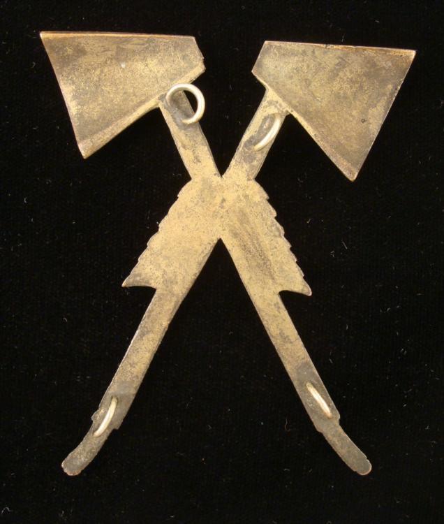 This unusual relic was sent in 1976 to the Smithsonian Institution for possible identification. Their experts were not able to come up with any answers. So, after decades in the hands of a collector, this item is finally going up for sale. The design is a pair of feather embellished, crossed tomahawks, which are native to North America. It is composed of brass tone metal, with impressed designs and details on front, and four loops on the reverse side. Each tomahawk head is slightly rounded, and concave on the reverse. The size measures 2 1/2 x 3 inches. The surface has normal patina. It is in excellent condition. Its age and origin are unconfirmed, but a military collector we have consulted believes it to be a uniform badge from the Indian Wars, and may date back as early as the 17th century. * This will be a remarkable find for anyone interested in unusual military insignia, and Native Americans in history. * Note: A copy of the letter is included.