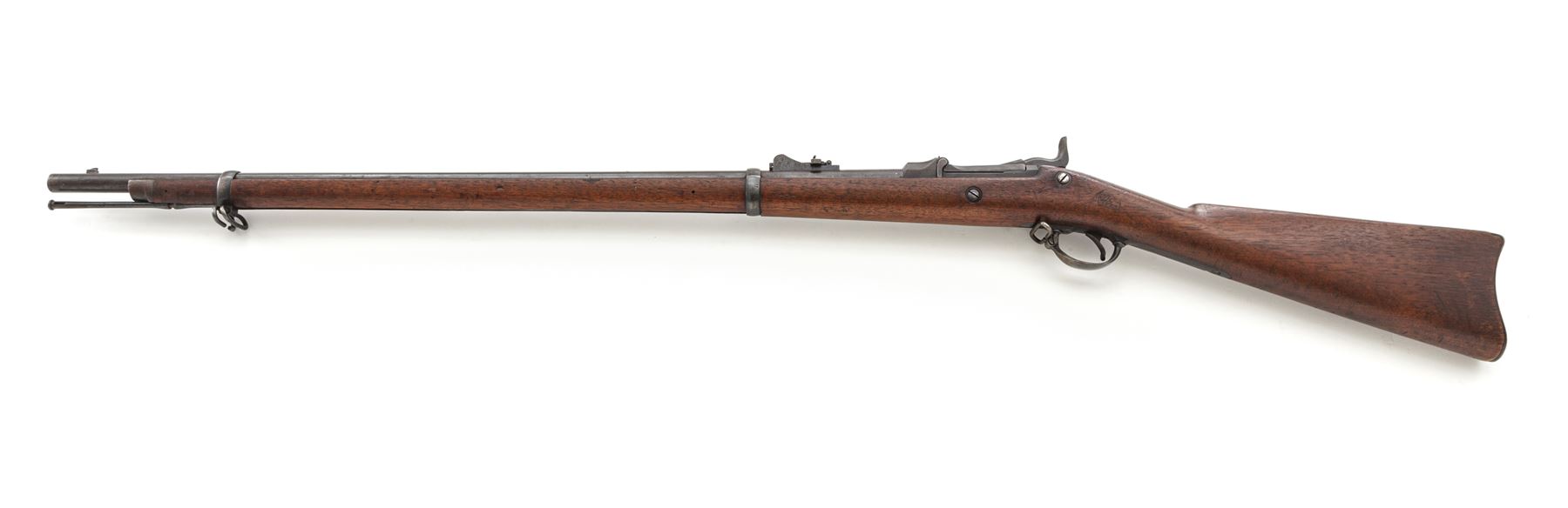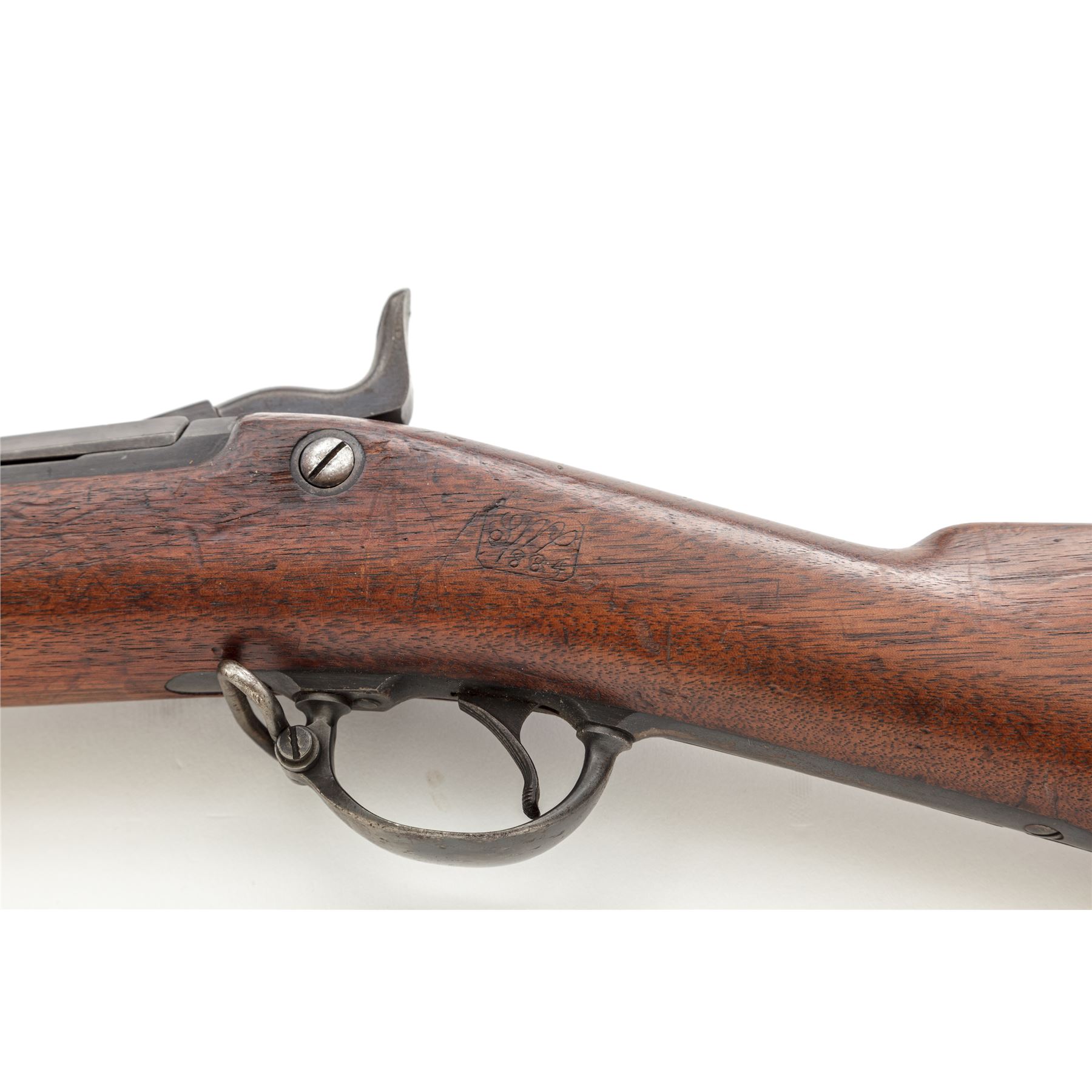Indian Wars U.S. Springfield Model 1873 Trapdoor Infantry Rifle, #256005, .45-70 Gov't. cal., 32-5/8'' barrel is marked ''V/P/(eaglehead)/P'' and ''P'' at breech with integral block-blade front sight (doubles as bayonet lug) and long-range adjustable rear sight (correctly marked ''R'' for Rifle); flat lockplate is marked ''(spread eagle)'' to left of ''U.S./Springfield'' beneath trapdoor latch; steel furniture including two spring-retained barrel bands (top with sling swivel), two-piece triggerguard with sling swivel, buttplate marked ''US'' on top tang, nosecap, slotted button-head cleaning rod; one-piece oil-finished walnut fullstock. Condition is very good, the barrel with a smooth brownish-blue patina and balance of the metal gunmetal gray with all markings sharp. Stock is smooth and solid with the expected light marks of military use and a very clear ''SWP/1884'' cartouche of armory inspector Samuel W. Porter at left wrist. Action is strong and smooth; bore is shiny with sharp rifling. Est.: $800-$1,200. (Antique)