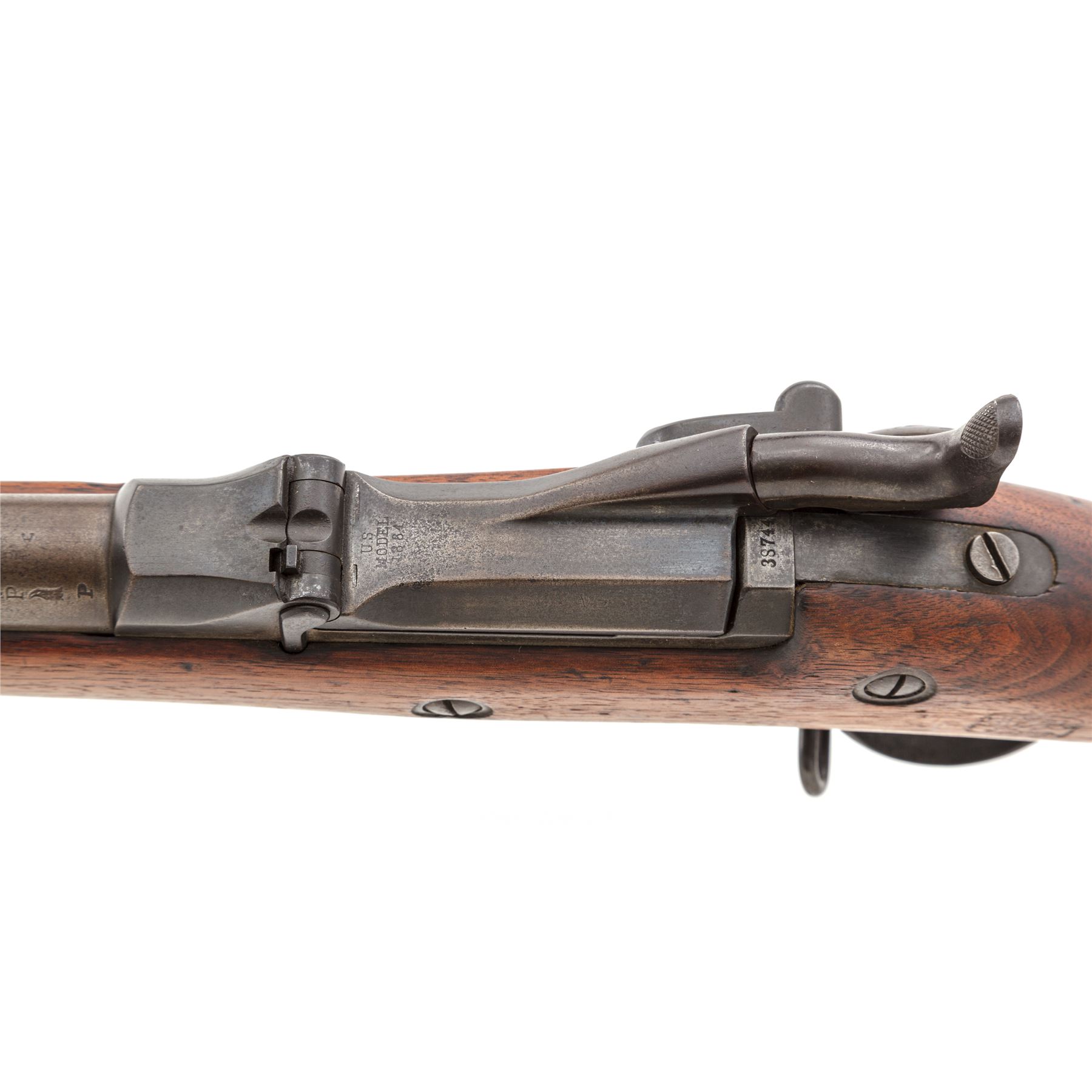 Indian Wars U.S. Springfield Model 1884 Trapdoor Infantry Rifle, #387446, .45-70 Gov't. cal., 32-5/8'' barrel is marked ''V/P/(eaglehead)/P'' and ''A'' at breech and fitted with block-blade front sight (also serves as a bayonet lug) and Buffington adjustable rear sight; flat lockplate is marked ''(spread eagle)'' to left of ''U.S./Springfield'' beneath trapdoor latch; steel furniture including two spring-retained barrel bands (top with stacking swivel), two-piece triggerguard (with sling swivel at front), buttplate marked ''US'' and ''2/H/55'' on top tang, nosecap, slotted button-head steel cleaning rod; one-piece oil-stained walnut fullstock deeply struck ''2/H/55'' ahead of buttplate tang. Mfg'd 1888. Condition is very good, the barrel a gunmetal-brown patina having scattered light dings between top band and muzzle, balance of the metal a dark gunmetal gray showing traces of case hardening, buttplate with cleaned erosion. All markings are clear. Stock is smooth and solid with nice color and a crisp ''SWP/1888'' cartouche of armory inspector Samuel W. Porter at left wrist and an encircled ''P'' on belly. Action is strong and smooth; bore is clean with distinct rifling. Est.: $500-$800. (Antique)