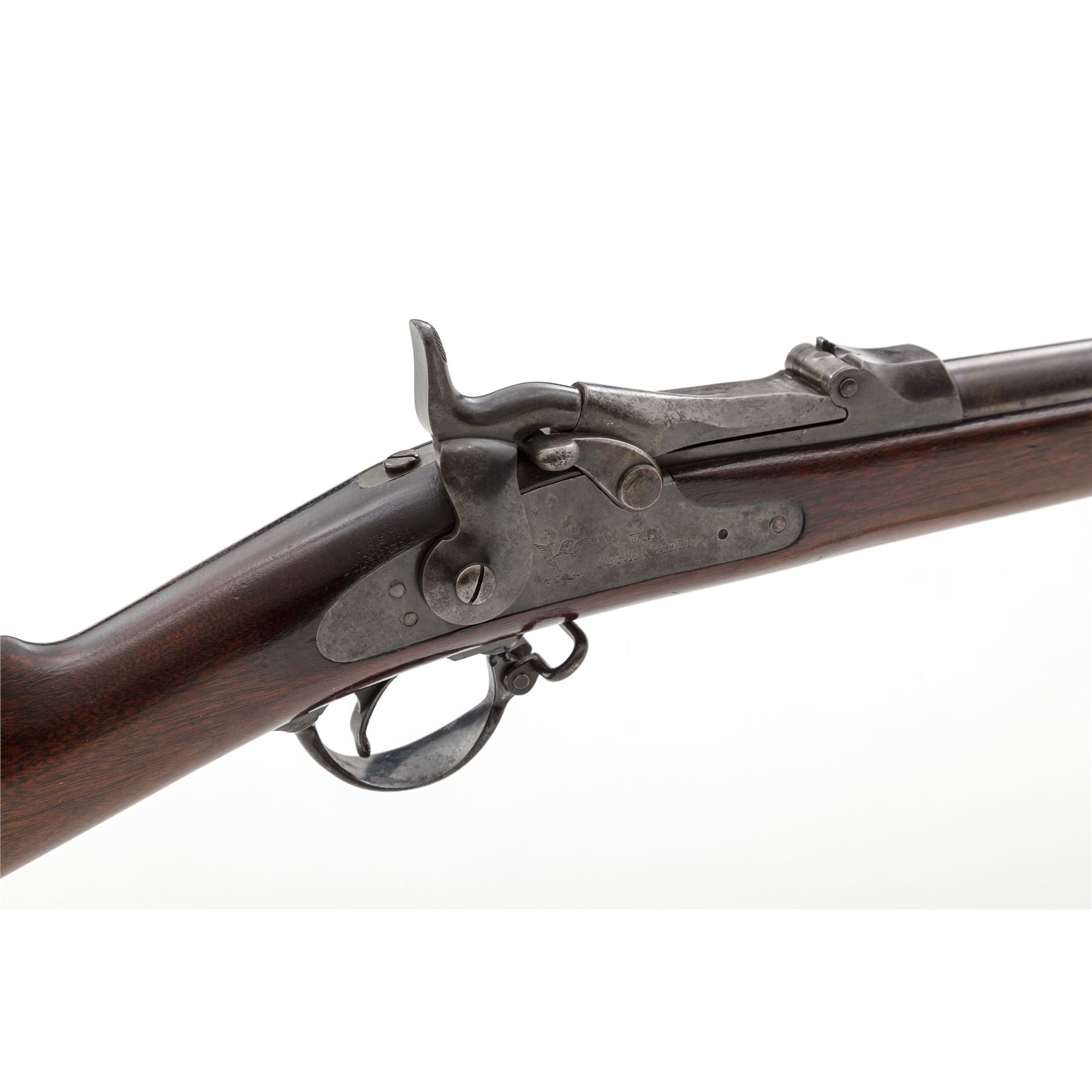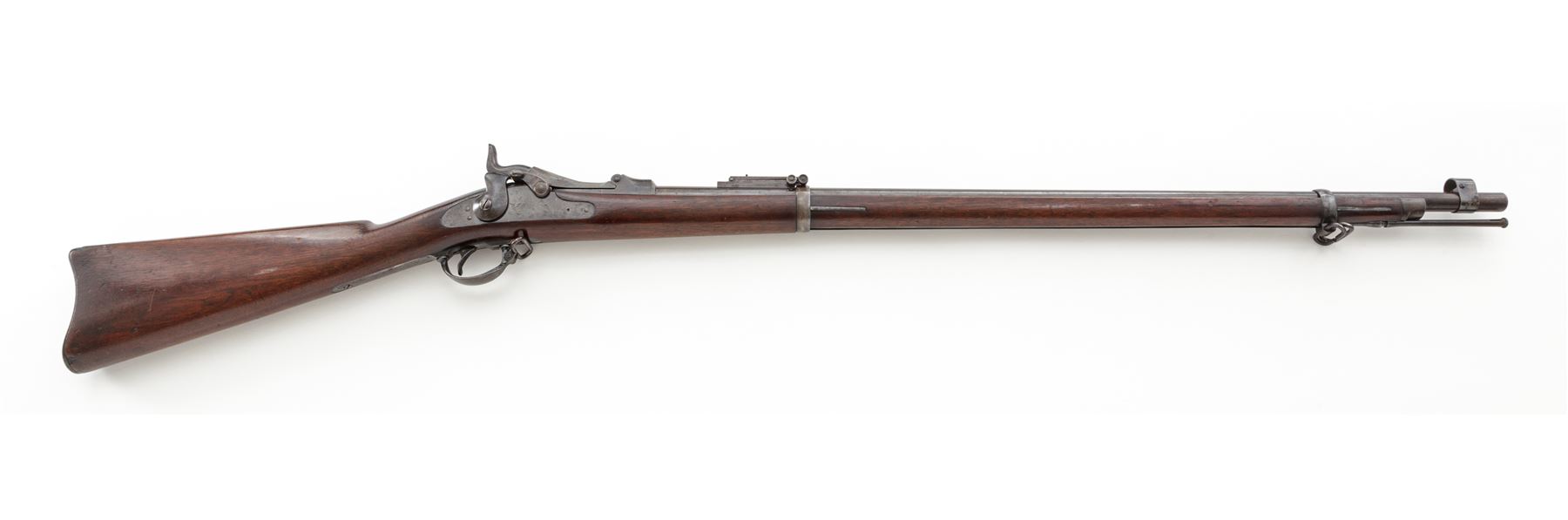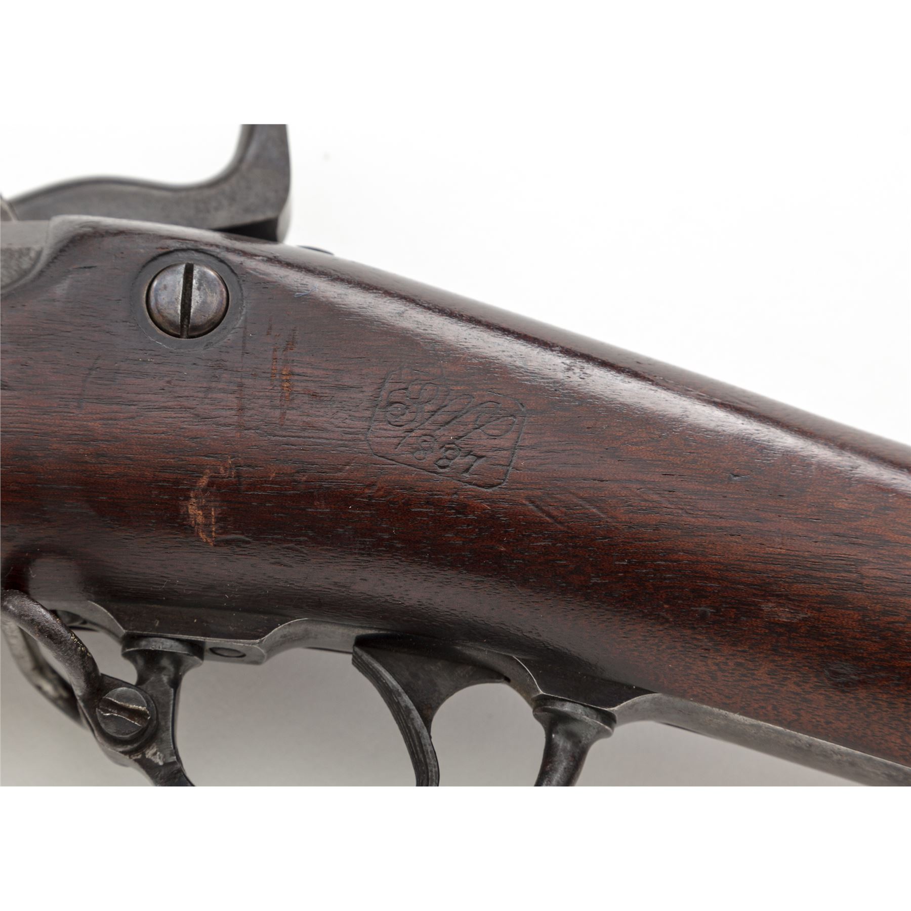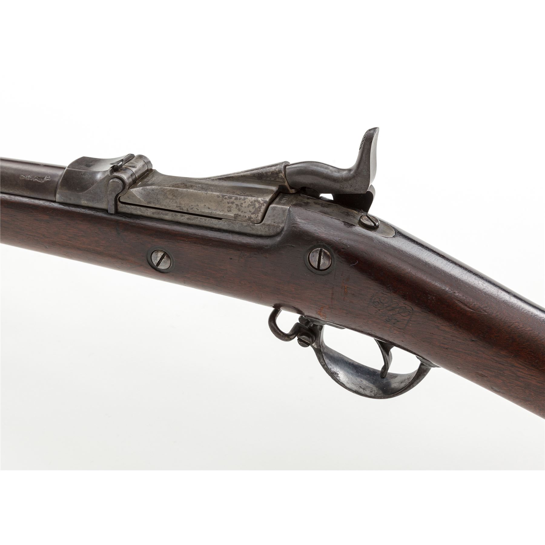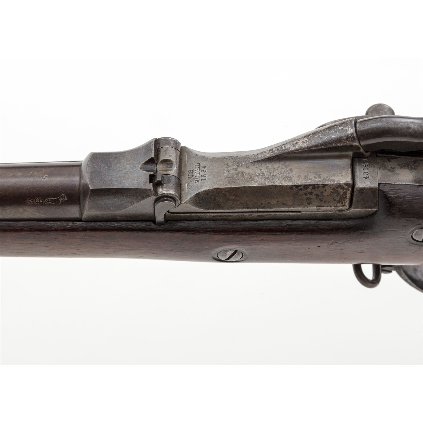 Indian Wars U.S. Springfield Model 1884 Trapdoor Infantry Rifle, #401491, .45-70 Gov't. cal., 32-5/8'' barrel marked ''V/P/(eaglehead)/P'' and ''A'' at breech and fitted with a hooded front sight and Buffington adjustable rear sight (correctly marked ''R'' for Rifle); flat lockplate is marked ''(spread eagle)'' to left of ''U.S./Springfield'' beneath trapdoor latch; steel furniture including two spring-retained barrel bands (top with sling swivel), two-piece triggerguard with sling swivel, buttplate marked ''US'' on top tang, nosecap, slotted button-head cleaning rod; one-piece oil-finished walnut fullstock. Condition is very good, the barrel with a smooth brownish-blue patina and balance of the metal gunmetal gray with all markings sharp. Stock is smooth and solid with perhaps a light coat of varnish added and a very clear ''SWP/1887'' cartouche of armory inspector Samuel W. Porter at left wrist. Action is strong and smooth; bore is clean with distinct rifling. Est.: $800-$1,200. (Antique)