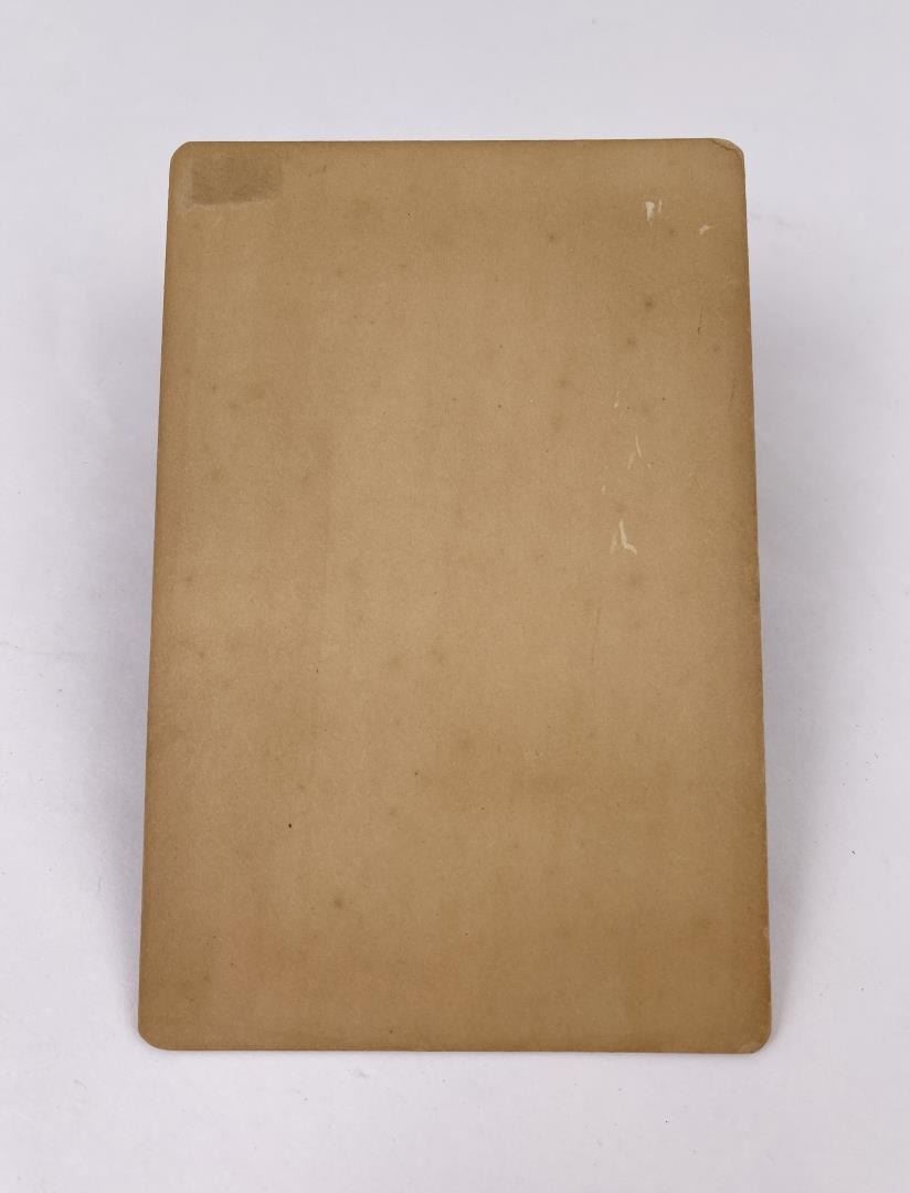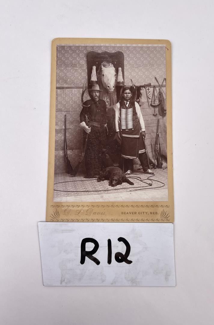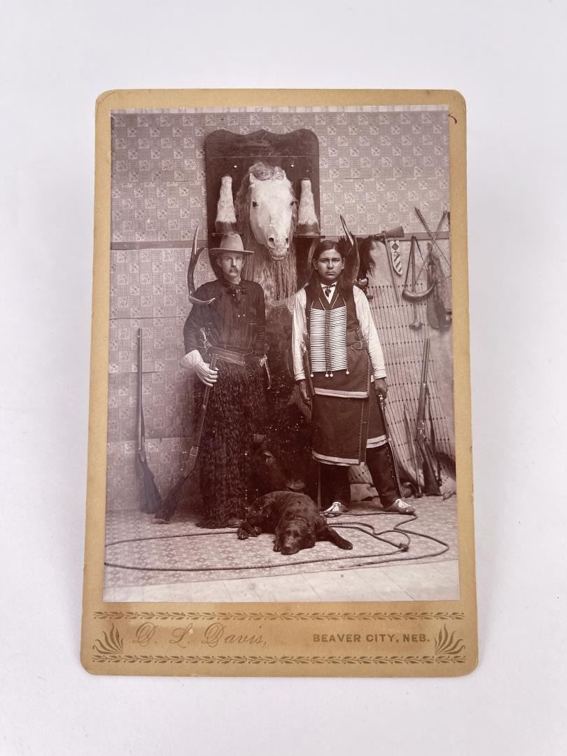 Wonderful early cabinet card. The man is wearing wooly chaps, and white US Cavalry Gloves. He appears to be holding a large caliber Winchester Takedown rifle. The Native American Man appears to be a US Indian Scout. He is holding a Schofield Revolver and has another on his belt. Behind the Cavalry soldier is his horse, which has been mounted. At their feet lays a cattle dog, laying in a rawhide riata. Photographer is Davis of Beaver City Nebraska.