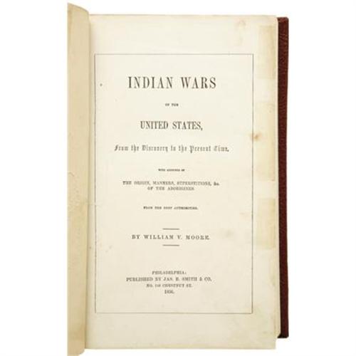 <B>William V. Moore ie. John Frost : With Seven Full-Page Hand-Colored Plates <I>Indian Wars of the United States,</B></I></B></I>From the Discovery to the Present Time. With Accounts of The Origin, Manners, Superstitions, &c. of the Aborigines. From the Best Authorities. (Philadelphia: Published by Jas. B. Smith & Co., 1856). Early edition, originally published in 1850. Octavo (8.5” x 5”). 328 pp. Profusely illustrated, including seven plates colored by hand. In a modern binding of morocco-grained cloth, lettered in gilt on the spine. Hand-colored plates are on stock that is a bit browned, some with edge chips, double plates at the front with pin-holes outlining the figures, and with tape around the edges and small faint dampstains to the edges. Generally, a very good copy. An excellent overview of the period of Indian conflicts and culture before the Civil War.<BR><BR><b>Shipping:</b> Books & Catalogs (<a target="_blank" href="http://www.heritageauctions.com/common/shipping.php">view shipping information</a>)
