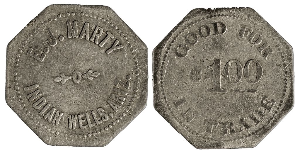 Octaganol : Obverse: E.J. Marty / Indian Wells, Ariz.; reverse: Good For / $1.00 / In Trade. Al, 38mm, R6. About good condition.City: Indian WellsCounty: Navajo State: AZDate: