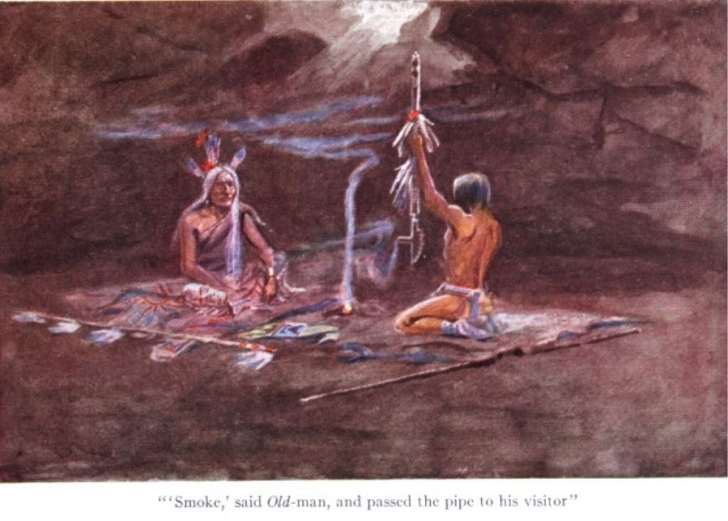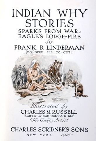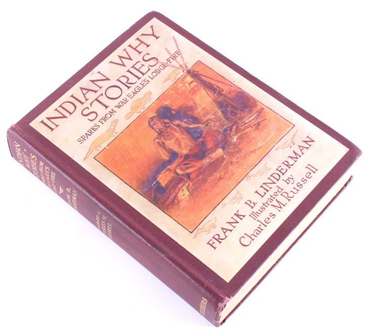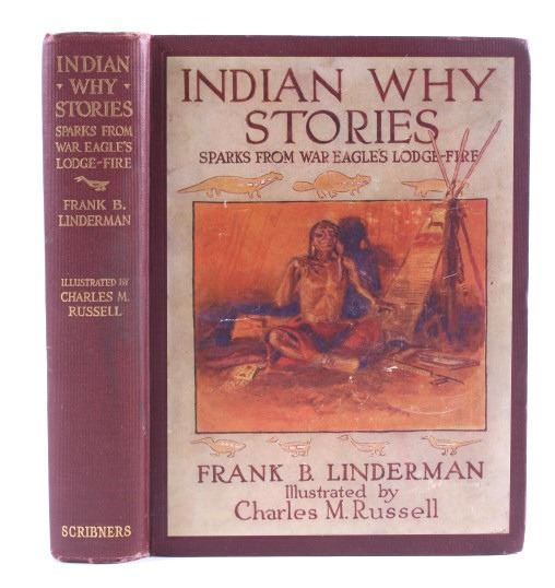 This is a scarce first edition of "Indian Why Stories: Sparks from War Eagle's Lodge-Fire" written by Frank Linderman and illustrated by Charles Russell and published in 1915. The book is comprised of numerous Native American Indian folklore stories including "Why the Chipmunk's Back is Striped", "Why Blackfeet Never Kill Mice", "Why the Indians whip the Buffalo-Berries from the Bushes" and many more. The book is a renowned collaboration between Linderman and Russell who were good friends. The book is in good to very good condition. It measures 6.25" x 8.25".