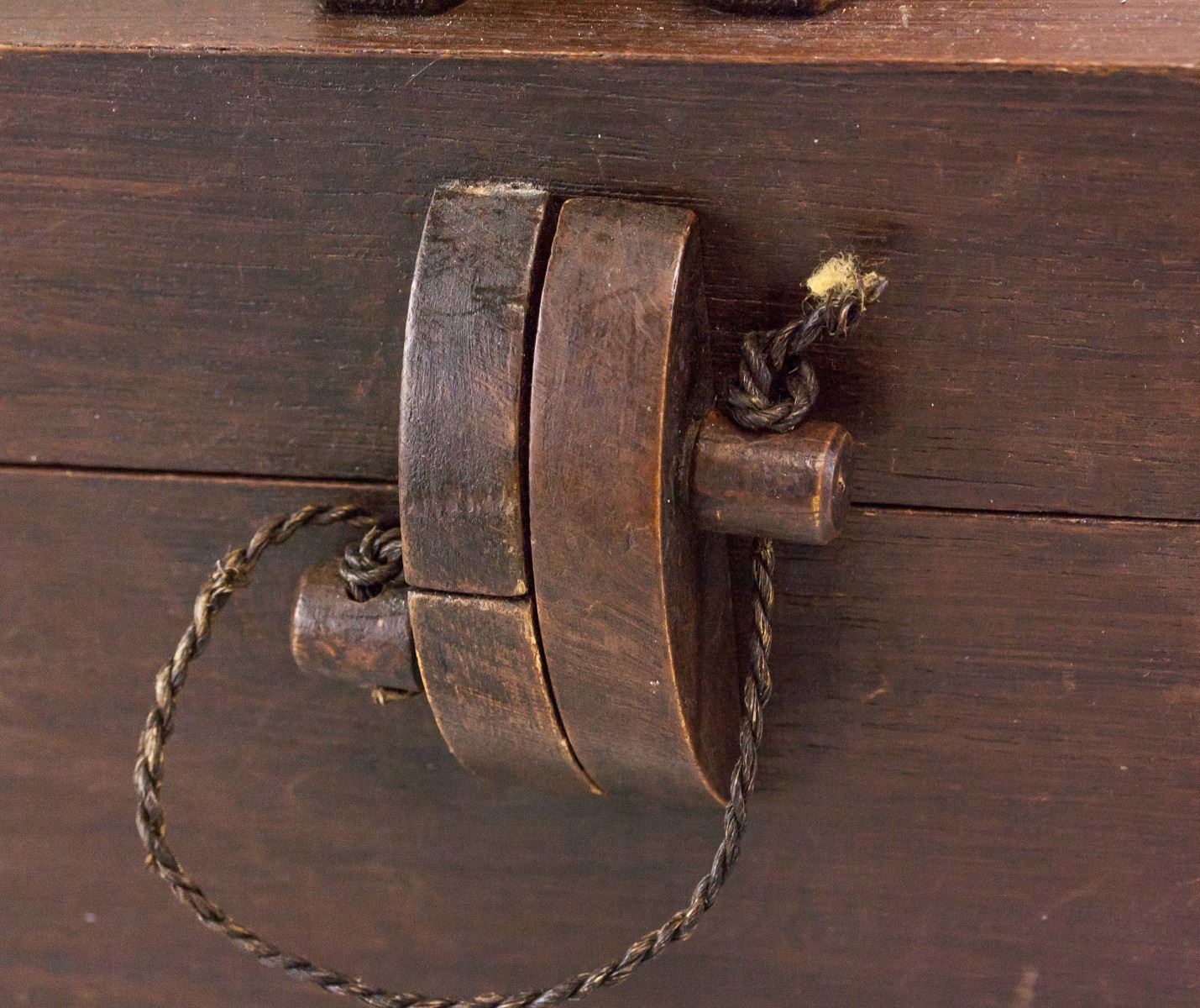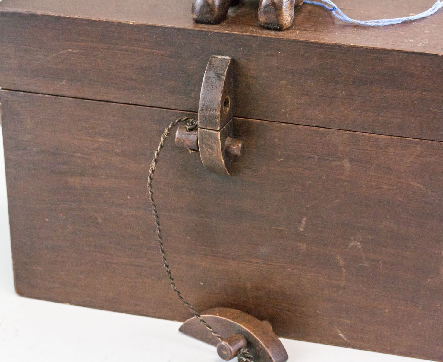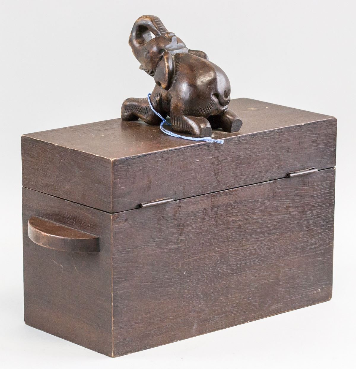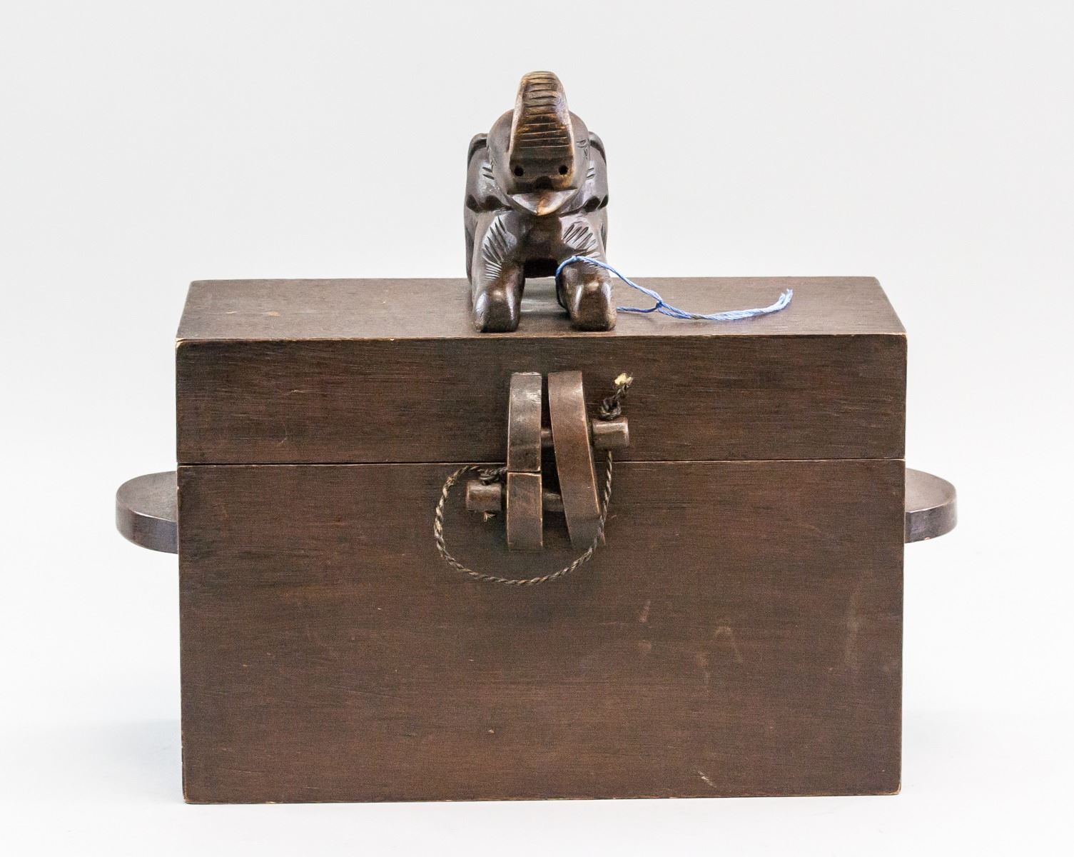 Indian wooden box. With semi-circle handles the side. Decorated with wooden carved elephant on top of the lid. 19 x 28 cm, 1858 grams.