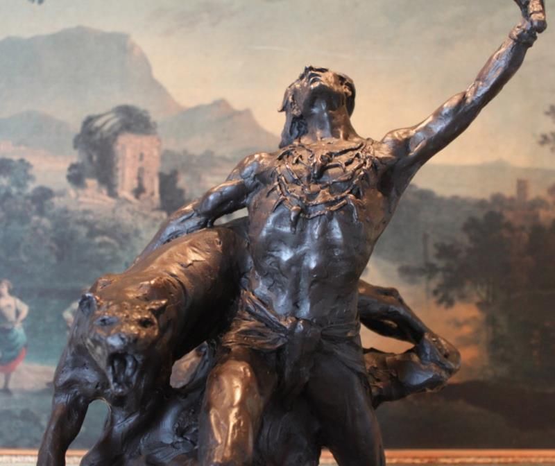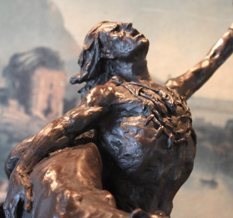 Indian and Panther Bronze Sculpture, 21 H x 15L x 10D 42lbs. This bronze sculpture was produced using the "Lost Wax" casting method. The "Lost Wax" Cast method is the most precise metal casting technique in existence, ensuring exquisite detail of the original host model which is usually sculpted in clay or wax. This "Lost Wax" casting method is an extremely labor intensive and expensive process, but the end results produce a Heirloom Quality Masterpiece!