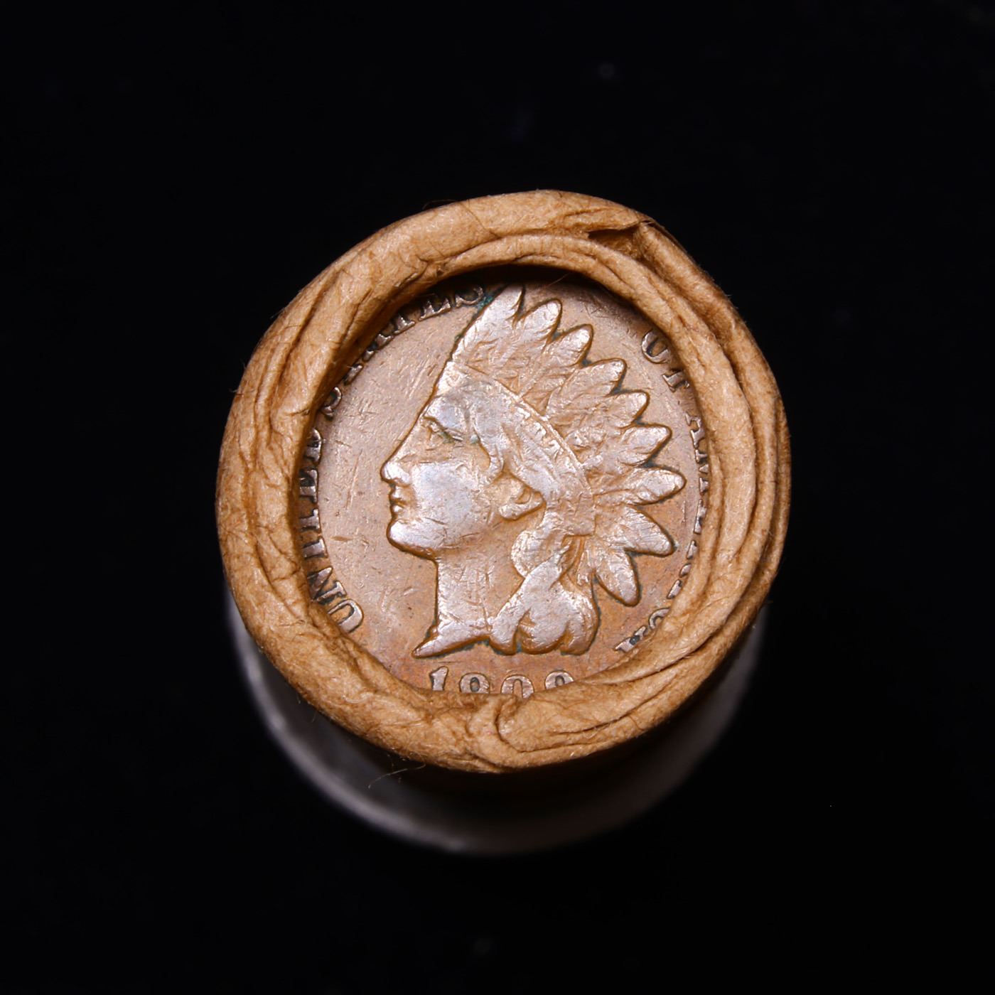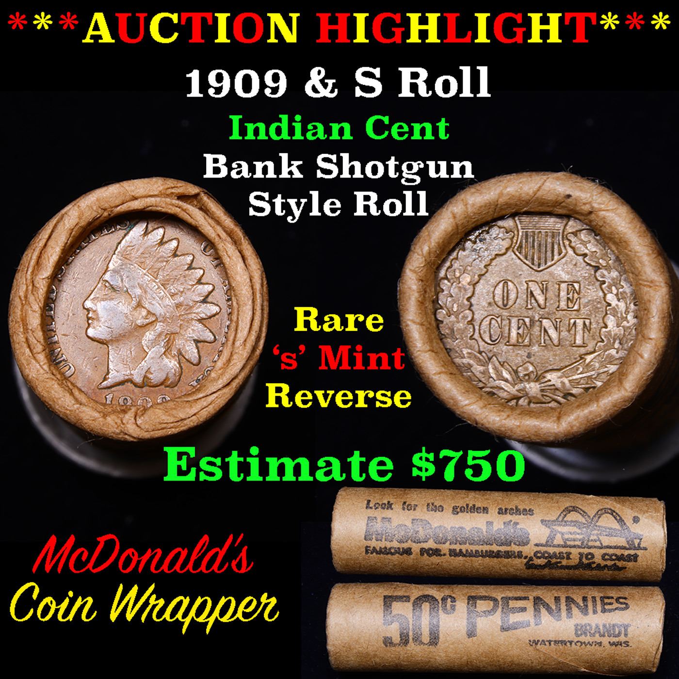 Indian cent 1c orig roll, 1909 end S other end. Lincoln Wheat cent 1c original Shotgun Roll, 1909 on one end, S reverse on the other. The roll is held in a Rare & Collectable McDonalds Brandt wrapper. Actual roll pictured is the roll you will get. A great original bank shotgun roll with very tight ends. From the feedback we have been receiving, people are happy with these rolls, nearly half the roll seems to be teens, all the rolls have a few Indians, most of the rolls have some steel cents, and a lot of the wheaties are mintmarks. These shotgun rolls are all from a new consignee. They are all frrom one Estate. This particular Roll shows a 1909 on one end and a S reverse on the other end.