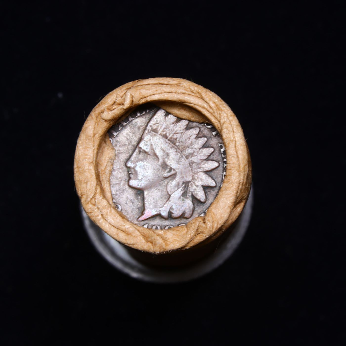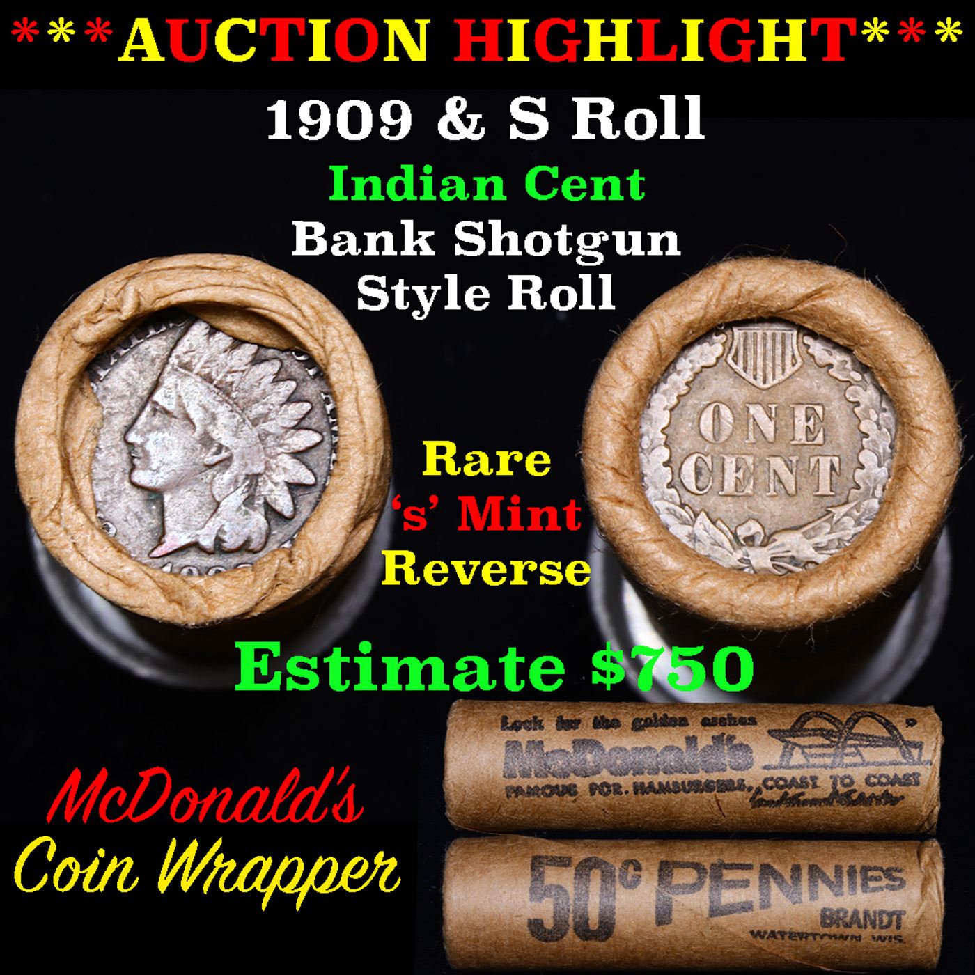 Indian cent 1c orig roll, 1909 end S other end. Lincoln Wheat cent 1c original Shotgun Roll, 1909 on one end, S reverse on the other. The roll is held in a Rare & Collectable McDonalds Brandt wrapper. Actual roll pictured is the roll you will get. A great original bank shotgun roll with very tight ends. From the feedback we have been receiving, people are happy with these rolls, nearly half the roll seems to be teens, all the rolls have a few Indians, most of the rolls have some steel cents, and a lot of the wheaties are mintmarks. These shotgun rolls are all from a new consignee. They are all frrom one Estate. This particular Roll shows a 1909 on one end and a S reverse on the other end.