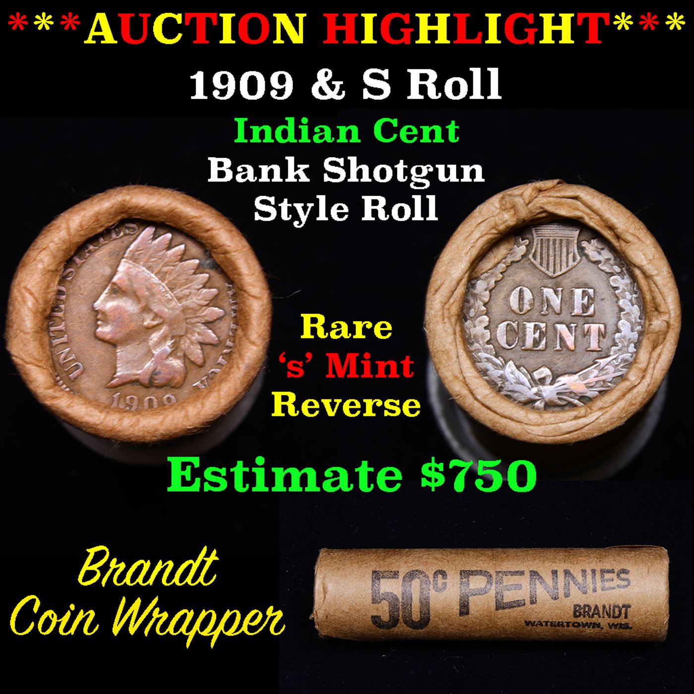 Indian cent 1c orig roll, 1909 end S other end. The roll is held in a Rare & Collectable McDonalds Brandt wrapper. A great bank style shotgun roll of Indian cents 1c with very tight ends. The rolls appear to be filled with a mixture of 1800's and 1900's. These shotgun rolls are all from a new consignee. They are all frrom one Estate. This particular Roll shows an 1909 on one end and a KEY date 's' mint on the reverse WOW!.