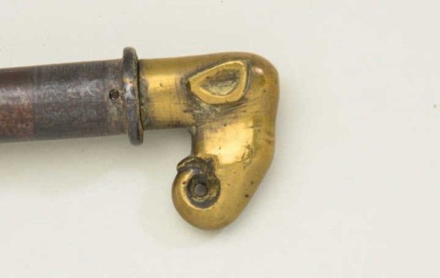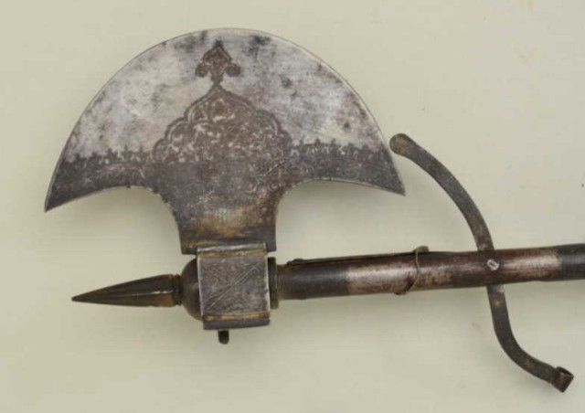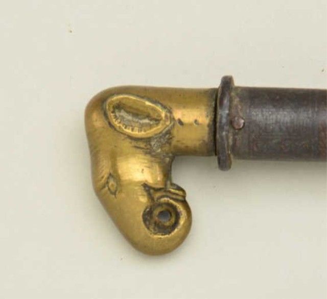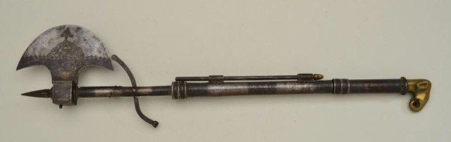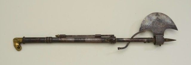 Indian matchlock combination battle axe and dagger with silver inlay and brass accents. Refer “Vari-Type Firearms” by F. Theodore Dexter featuring the Frank Biven’s Collection and “Blades and Barrels” by Gordon Frostpage 10 & 11. The weapon measures 22 1/2” overall and is approximately .45 caliber. The metal surfaces show considerable darkened silver inlay. The elephant head doubles as a pommel for the dagger which screws into thebore. A small brass dog head is mounted on the top of the ram rod. Condition is good to very good and uncleaned. A brass collection tag number 1163 is attached and is type used by Biven’s. This original matchlock wasviewed by Ron Mac Wille who used it as a pattern for modern copies in the 1950’s. From an old N.Y. Collector’s Estate. Est.; $1,500-$3,000