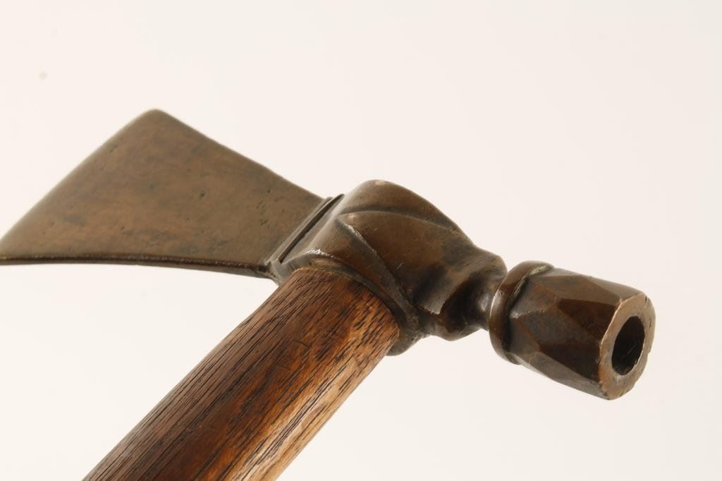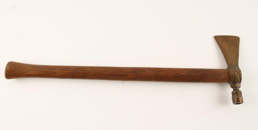 Indian pipe tomahawk, bronze or brass edge with 20th Century replacement shaft approximately 22” long. Est.: $300-$600.
