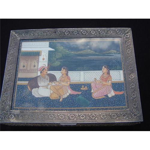 Indian silver box with chiseled decorations on sides. The lid is decorated with a miniature hand painting on paper featuring a man and 2 women in an Indian castle-fort. This is a heavy silver box and the miniature painting is protected by a glass cover. Dimensions: 8" X 6.2" (20 cm. X 16 cm.). Estimated retail value: $2000.