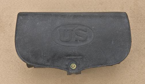 Indian war period cartridge box with large US embossed at center. Fabric loops in three rows in interior for 24 rounds. Original loop and taps intact. Very good condition. Est: $150 - $300