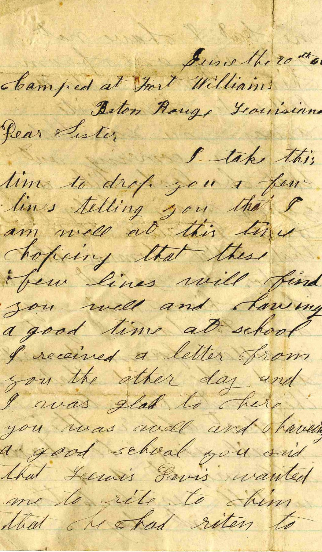 Four page Civil War letter from Erastus Pollett of the 1st Indiana Heavy Artillery. Composed shortly before the regiment embarked on operations that led to the capture of Forts Gaines and Morgan. Datelined 20 June 1864 from ''Fort Williams Baton Rouge Louisiana,'' letter reads in part: ''...it is a geting tolerabel warm down here now but we have got shades over our tents...it is tolerabel comphortabel in the shade in the day time but the misketos almost eat us up at night. there was an aligater killed the other day down in the river it was about 6 feet long...the picture of one represents one exactly. they had to shoot it 4 times be fore they killed it...we are a haveing a tolerabel good time down here we stay in one place all the time we dont have no marching to do we have tolerabel heavy guard duty to do but I would rather do that than to be a marching around all the time there is 2 companys A and G got marching orders for Morgans bend but our Company will stay here a while yet...'' The 1st Indiana engaged the enemy at Baton Rouge, Mobile and the Siege of Port Hudson, and aided in the capture of Forts Morgan, Gaines and Spanish Fort. Pollett mustered into service on 10 October 1863. Ink letter measures 4.5'' x 7.5''. Some wear at folds and overall wrinkling, overall very good condition.