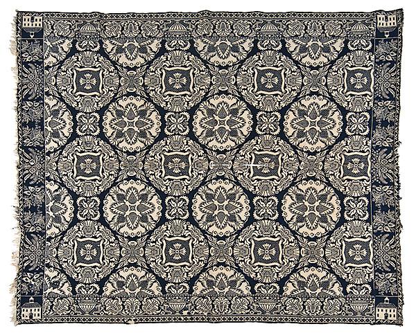 Canton, Washington County, Indiana (attributed), ca 1852 to 1864, dark blue wool and natural cotton. A double weave jacquard coverlet with center seam. Courthouse logo in four corners; 87" x 76".