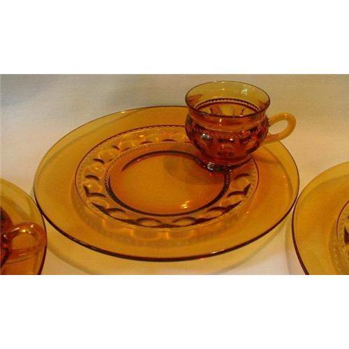 Indiana Glass Kings Crown snack sets in amber. Price is for all fourteen sets. Each set consists of one 10.5" plate and one cup measuring 2.5" high and 3.25" in diameter. 28 pieces in all. No nicks, chips or cracks.