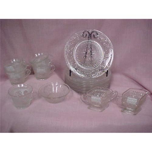 Indiana Glass Sandwich Pattern 22 Piece Set- Beautiful raised glass pattern featuring flowers and other decorative symbols. Includes 9 Snack plates and cups (4x3"), 1 extra snack plate (8.5"), 1 creamer (5.5x3"), 1 open sugar bowl (6x3"), and 1 small fruit/dessert bowl (5x2"). All pieces are in very good condition aside from minor chips on the rims of a few cups and plates. All measurements are approximate.