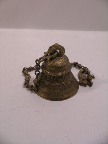 From 'Indiana Jones and the Temple of Doom' (1984), the second film in the Indiana Jones franchise starring Harrison Ford. This is a heavy, brass bell with detailed symbols engraved along the outside. A brass chain is connected to it, and at one end, there is a hook, made to resemble a swan. This piece has some fair wear from time spent on set. (Measures approx. 5" x 5" x 6")