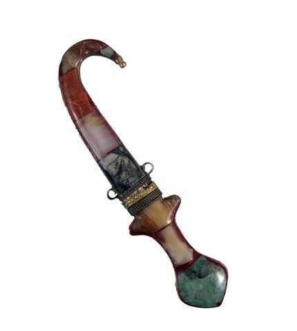 Indiana Jones Temple Of Doom Dagger Prop - From "Indiana Jones and the Temple of Doom" (1984) comes this kirpan ceremonial style dagger, with a soigné elegance of layers of polished rock sheath and removable faux-stone blade, used as a background in the production. (Approx. 11" long).