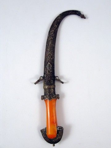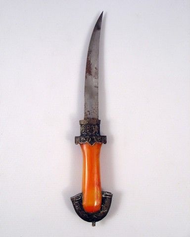 An extremely ornate and beautiful cared and finished Kirpan-style Sikh knife from "Indiana Jones and the Temple of Doom" (1984). The blade has been "stained" with either a rust patina (or could it be "blood"?!). With an eye-popping orange faux-ivory handle. (Approx. 13 1/2" long).
