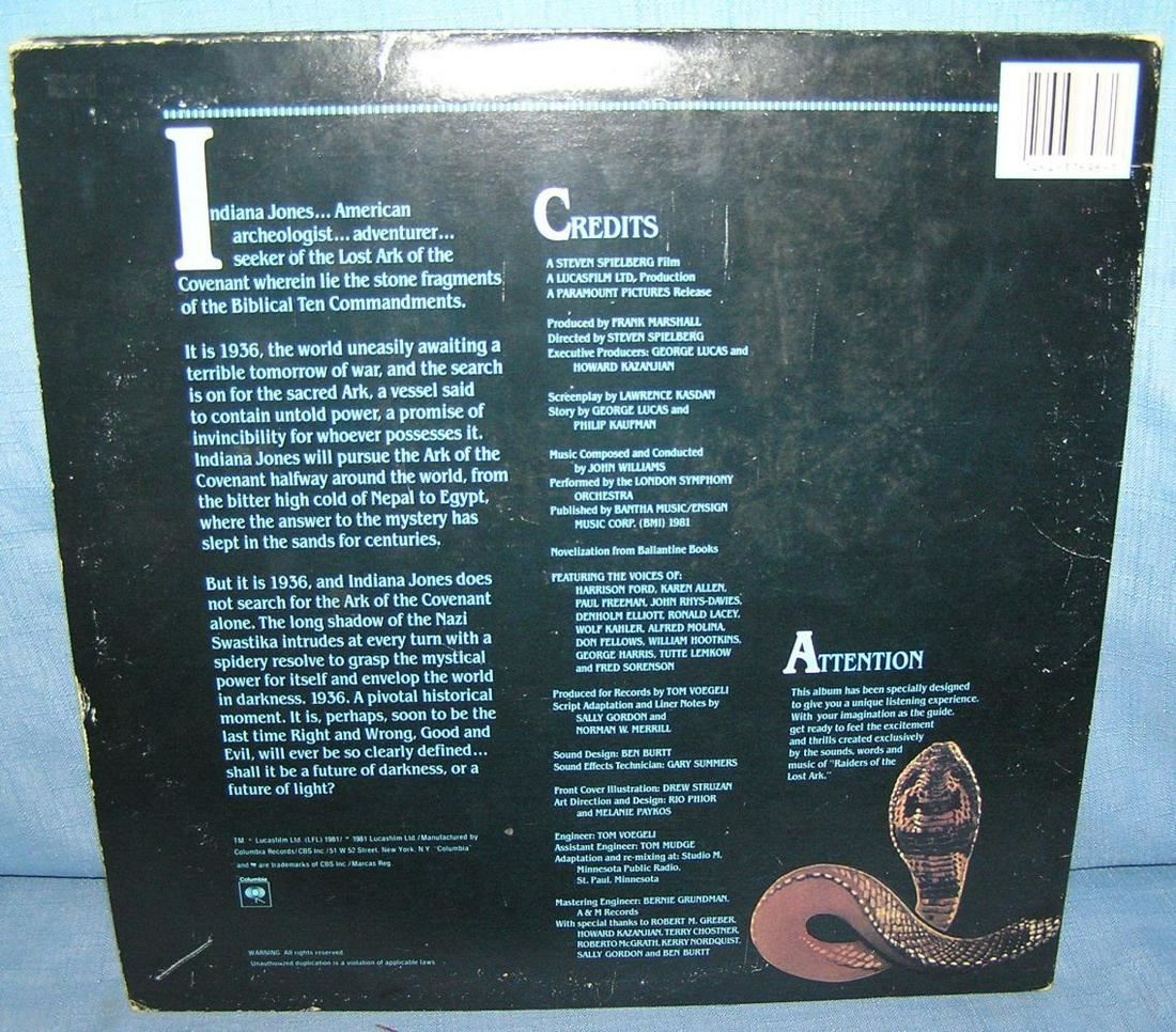 Vintage Indiana Jones and the Raiders of the Lost Arc action movie record album circa 1981 est. value $50.00-$65.00