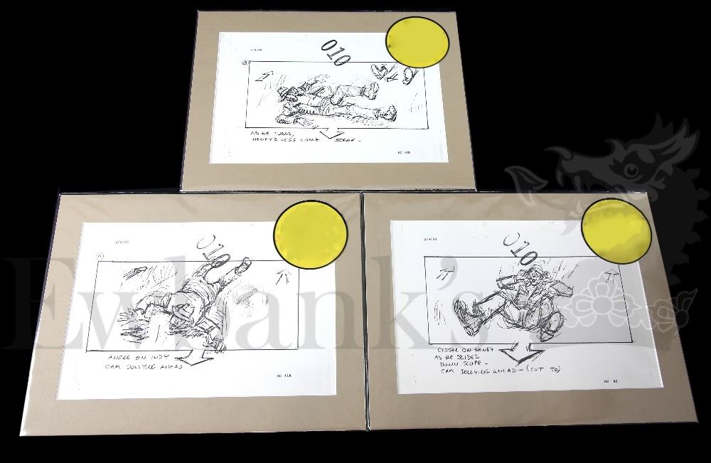 † Indiana Jones and The Last Crusade (1989) A group of three different production used storyboards depicting Indiana and Henry Jones sliding down a slope after their plane crash. Individually mounted and board backed within acetate baggies. Please note that VAT is payable on top of the hammer price at 20% in addition to standard buyers premium inc. VAT for this lot.