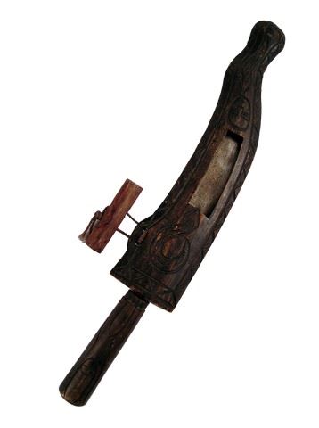 Acquired direct from the set of the world favorite movie Indiana Jones and the Kingdom of the Crystal Skull (2008) is this very unique and original studio distressed metal knife with carved wood sheath and handle. This measures approximately 17" long.