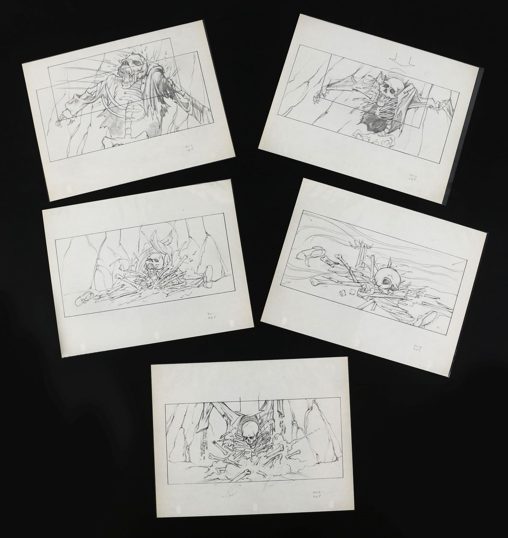 Indiana Jones and the Last Crusade (1989) Five original hand drawn storyboard sequences showing the Donovan choosing poorly storyboard sequence featuring Donovan’s death scene with his skeleton crashing to the ground, in pencil with production notation arrows for the shots in the margins. Each 22 x 28 cm (5).Provenance: Profiles In History Lot 974 - 16/12/11.