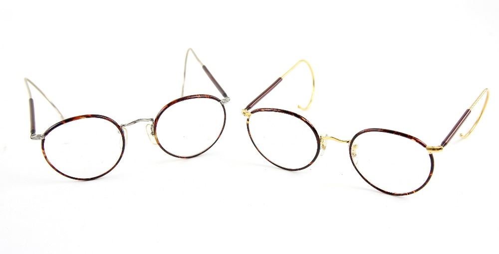 Indiana Jones and the Last Crusade (1989) - Harrison Ford as Indiana Jones, two pairs of wire frame glasses, one pair with gold coloured wire and the other pair silver coloured. Round clear lenses, bordered faux tortoiseshell finish, clear nose pads, curved metal wire earpieces. The Left frame arm on the gold pair inscribed 'FRAME MADE IN ENGLAND 170'. (2). Harrison Ford wore the silver pair at the start of the movie and wore the gold pair towards the end of the movie.Provenance: From the collection of Simon Murray (Onspec-Ontic).