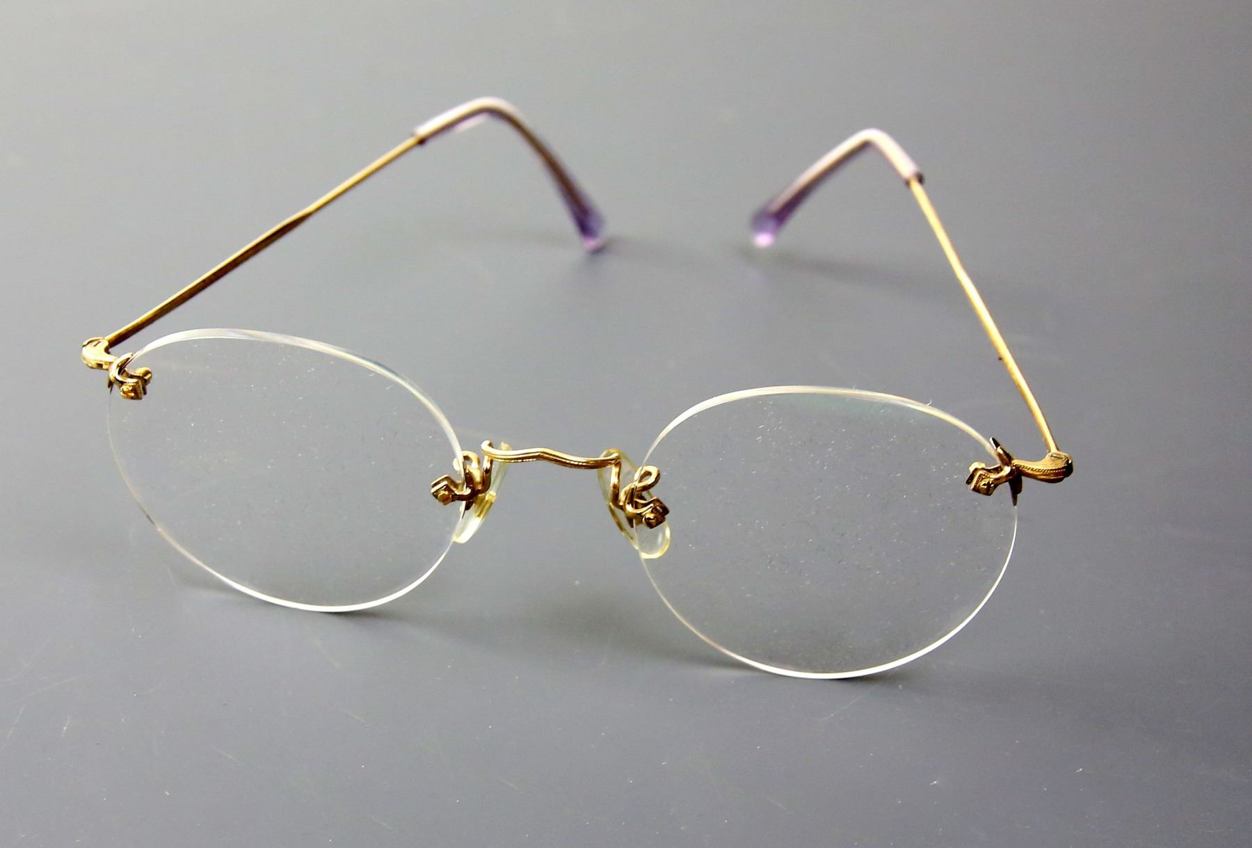 Indiana Jones and the Last Crusade (1989) - Sean Connery as Professor Henry Jones, a pair of gold metal wire frame glasses. Round clear lenses, clear nose pads, gold metal earpieces tipped with transparent plastic. Left frame arm inscribed 'FRAME MADE IN ENGLAND' and the right 'SAVILE ROW'. Provenance: From the collection of Simon Murray (Onspec-Ontic).