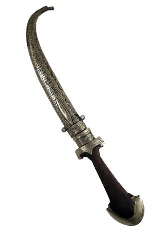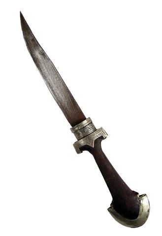 Direct from the set of the classic world favorite action adventure franchise Indiana Jones and the Temple of Doom (1984) starring superstar Harrison Ford and Kate Capshaw is a production used metal knife with curved sheath direct from the set. Measures approximately 14" long.