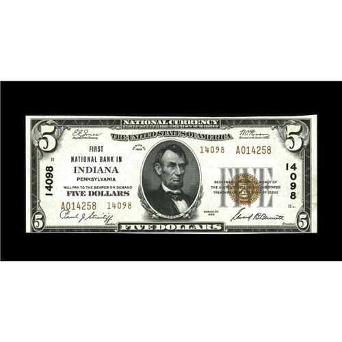 <B>Indiana, PA</B></I> - $5 1929 Ty. 2 <B>First NB</B></I> Ch. # 14098<BR>While the paper surfaces are of unquestionable Gem quality, centering issues mandate a grade of <B>Choice Crisp Uncirculated.</B></I> Three banks were located here, with this institution being the only one to order the $5 Type 2. 14000 charter notes are always eagerly sought when they appear at auction and continue to be part of an expanding collecting specialty.<BR><BR><b>Shipping:</b> Coin/Currency (<a target="_blank" href="http://www.heritageauctions.com/common/shipping.php">view shipping information</a>)
