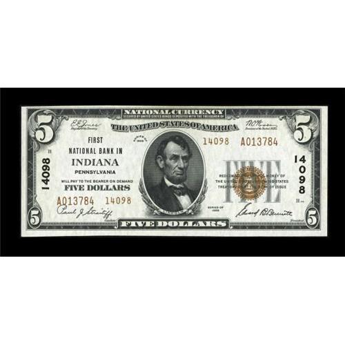 <B>Indiana, PA</B></I> - $5 1929 Ty. 2 <B>First NB</B></I> Ch. # 14098<BR> The paper quality is exquisite and complemented by bold embossing and solid margins. <B>Very Choice Uncirculated.</B></I><BR><BR><b>Shipping:</b> Coins & Currency (<a target="_blank" href="http://www.heritageauctions.com/common/shipping.php">view shipping information</a>)