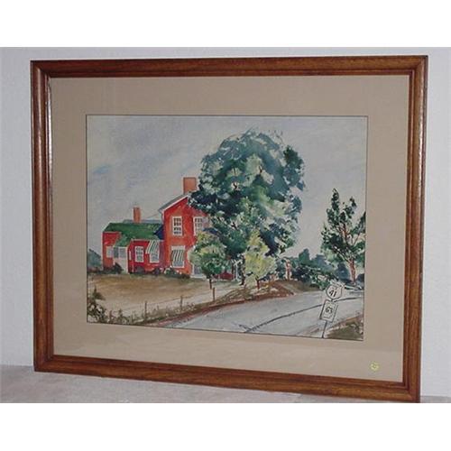 A large framed watercolor of a red farmhouse on US route 41 in Indiania state road 63, the house is nestled under a large tree, 30" long, 24" tall, framed with a very handsome oak frame. Signed Jane Cook lower right. Condition is good there is very minimal foxing, the matte is clean and lined with a black core boarding the watercolor. (10)