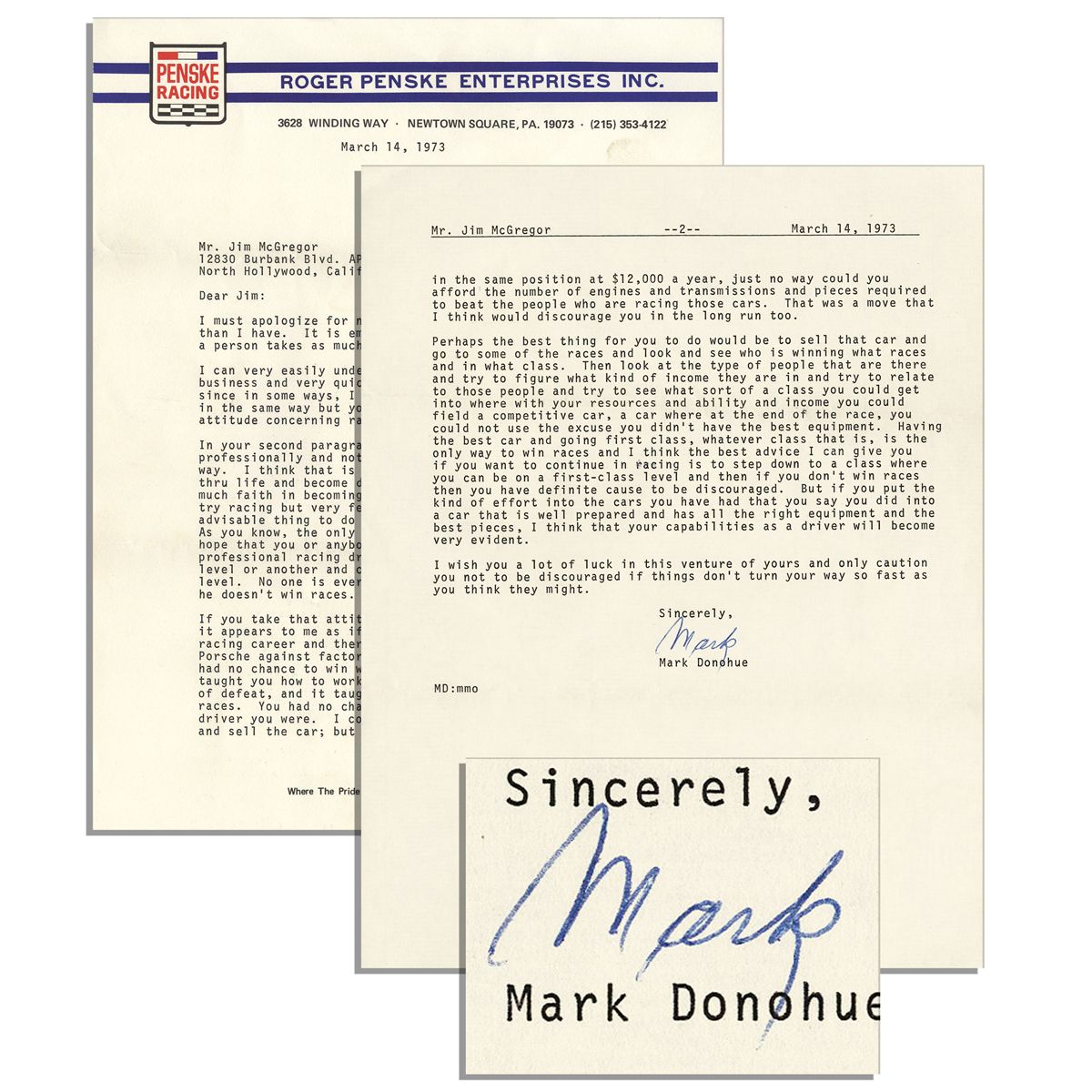 Mark Donahue typed letter signed on Roger Penske Enterprises Inc. letterhead, dated 14 March 1973. Letter is addressed to Jim McGregor, a fellow race car driver who wrote to Donahue for advice. Reads in part, ''...I can very easily understand your frustrations in the racing business and very quickly related to what you are going thru since in some ways, I went thru the same thing myself starting in the same way but you must be careful not to take the wrong attitude concerning racing...the only measure of success in racing and the only hope that you or anybody else has to become a successful racing driver is to start winning races up to the highest level. No one is ever going to become a professional driver if he doesn't win races...'' Letter on two pages is signed ''Mark'' in blue ink on page two. Measures 8.5'' x 11'' with two minor horizontal folds, else near fine. Includes original envelope.