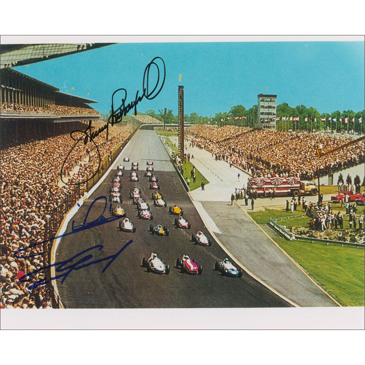 Two color glossy 10 x 8 photos from the Indianapolis 500, one signed in black felt tip by A. J. Foyt, the other signed in blue and black felt tip by Johnny Rutherford, Mario Andretti, and Dan Gurney. In fine condition.