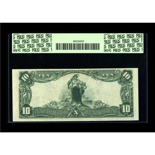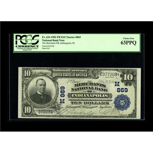 <B>Indianapolis, IN</B></I> - $10 1902 Plain Back Fr. 624 <B>The Merchants NB</B></I> Ch. # (M)869<BR>A bright and fully embossed note that appears through the encapsulation surfaces to be pack fresh. We suspect it likely would have been graded higher still but for a somewhat narrowed top margin. <B>PCGS Choice New 63PPQ,</B></I> a note that will delight its new owner and be a source of justifiable pride. Expect bids to top out in the range of...<BR><I>From The Bill and Kathy Stella Currency Collection</B></I><BR><BR><b>Shipping:</b> Coin/Currency (<a target="_blank" href="http://www.heritageauctions.com/common/shipping.php">view shipping information</a>)