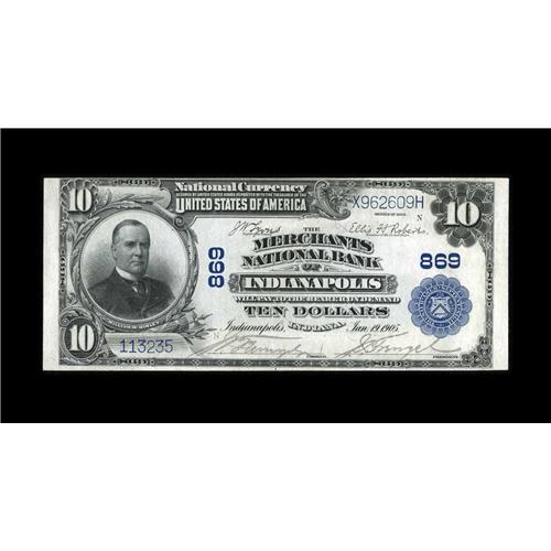 <B>Indianapolis, IN</B></I> - $10 1902 Plain Back Fr. 624 <B>The Merchants NB</B></I> Ch. # 869<BR>While this is a relatively available bank in lower grade, it is a bit more of a challenge to track down an example this nice. <B>About Uncirculated.</B></I><BR><I>From The Bill and Kathy Stella Currency Collection</B></I><BR><BR><b>Shipping:</b> Coin/Currency (<a target="_blank" href="http://www.heritageauctions.com/common/shipping.php">view shipping information</a>)