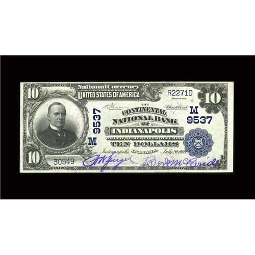 <B>Indianapolis, IN</B></I> - $10 1902 Plain Back Fr. 626 <B>The Continental NB</B></I> Ch. # (M)9537<BR>This nice <B>About Uncirculated</B></I> example is from an institution that ceased operations in 1931 after issuing Date Back and Plain Backs only in large. The nicely margined example we offer tonight is bright, retains plenty of snap and is especially enhanced by the vividly strong purple stamped officers' signatures. A challenging note in top grade well worth a premium bid to acquire.<BR><I>From The Bill and Kathy Stella Currency Collection</B></I><BR><BR><b>Shipping:</b> Coin/Currency (<a target="_blank" href="http://www.heritageauctions.com/common/shipping.php">view shipping information</a>)