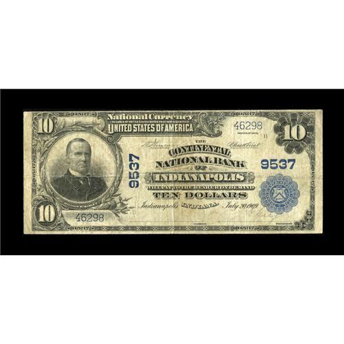 <B>Indianapolis, IN</B></I> - $10 1902 Plain Back Fr. 626 <B>The Continental NB</B></I> Ch. # 9537<BR>Only thirteen large are reported on this tougher Indianapolis bank. <B>Fine</B></I>.<BR><BR><b>Shipping:</b> Coin/Currency (<a target="_blank" href="http://www.heritageauctions.com/common/shipping.php">view shipping information</a>)
