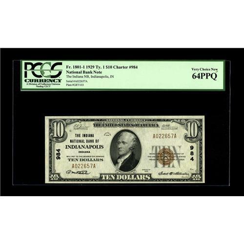 <B>Indianapolis, IN</B></I> - $10 1929 Ty. 1 <B>The Indiana NB</B></I> Ch. # 984<BR>This bank was located at the intersection of Virginia Avenue and Pennsylvania Street from 1897 to 1970. Officers are R.M. Fletcher and Frank D. Stalnaker. Plenty of embossing is seen on this bright example. Graded <B>Very Choice New 64PPQ</B></I> by PCGS.<BR><I>From The Bill and Kathy Stella Currency Collection</B></I><BR><BR><b>Shipping:</b> Coin/Currency (<a target="_blank" href="http://www.heritageauctions.com/common/shipping.php">view shipping information</a>)