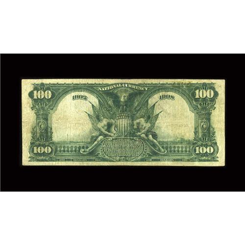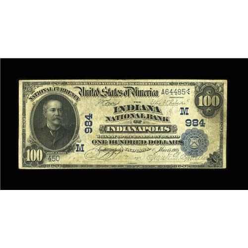 <B>Indianapolis, IN</B></I> - $100 1902 Date Back Fr. 689 <B>The Indiana NB</B></I> Ch. #(M)984<BR>This <B>Fine</B></I> $100 Date Back is one of just four of its type and denomination known from this issuer. High denomination notes have never enjoyed a higher level of interest than at present. We expect to see this this still quite presentable note sell for...<BR><I>From The Bill and Kathy Stella Currency Collection</B></I><BR><BR><b>Shipping:</b> Coin/Currency (<a target="_blank" href="http://www.heritageauctions.com/common/shipping.php">view shipping information</a>)