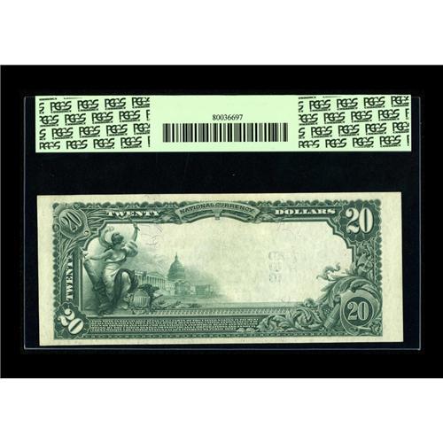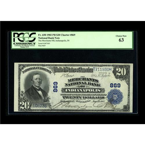 <B>Indianapolis, IN</B></I> - $20 1902 Plain Back Fr. 650 <B>The Merchants NB</B></I> Ch. # 869<BR>A <B>PCGS 63,</B></I> this bright note is the variety without the regional sorting letter. Amply margined all around, it presents with superior visual appeal and would likely have earned a higher grade with a touch more bottom margin. The boldly original and easily seen embossing should help this beautiful note reach at least...<BR><I>From The Bill and Kathy Stella Currency Collection</B></I><BR><BR><b>Shipping:</b> Coin/Currency (<a target="_blank" href="http://www.heritageauctions.com/common/shipping.php">view shipping information</a>)