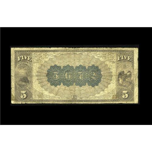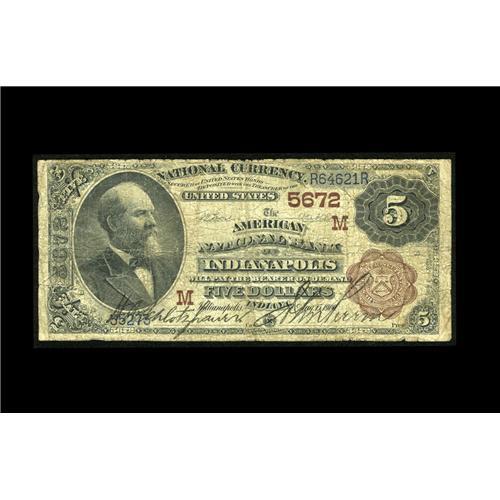 <B>Indianapolis, IN</B></I> - $5 1882 Brown Back Fr. 477 <B>The American NB</B></I> Ch. # (M)5672<BR>This short-lived bank issued Second Charter Brown Backs and Date Backs only in its ten years of operation. This note retains the signatures, though there are some splits about the margins and a few pinholes. <B>Very Good.</B></I>