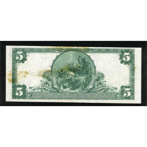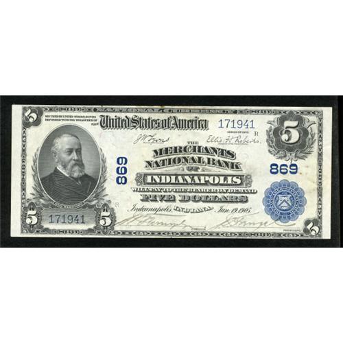 <B>Indianapolis, IN</B></I> - $5 1902 Plain Back Fr. 598 <B>The Merchants NB</B></I> Ch. # 869<BR> This is a lovely, bright note that has glue residue on the back. The upper serial number exhibits punch-through embossing. <B>Crisp Uncirculated</B></I>.<BR><BR><b>Shipping:</b> Coins & Currency (<a target="_blank" href="http://www.heritageauctions.com/common/shipping.php">view shipping information</a>)