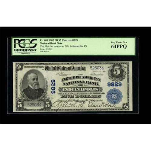 <B>Indianapolis, IN</B></I> - $5 1902 Plain Back Fr. 601 <B>The Fletcher American NB</B></I> Ch. # 9829<BR> A brightly inked and most attractive example. <B>PCGS Very Choice New 64PPQ</B></I>.<BR><I>From The Kansas City Collection.</B></I><BR><BR><b>Shipping:</b> Coins & Currency (<a target="_blank" href="http://www.heritageauctions.com/common/shipping.php">view shipping information</a>)